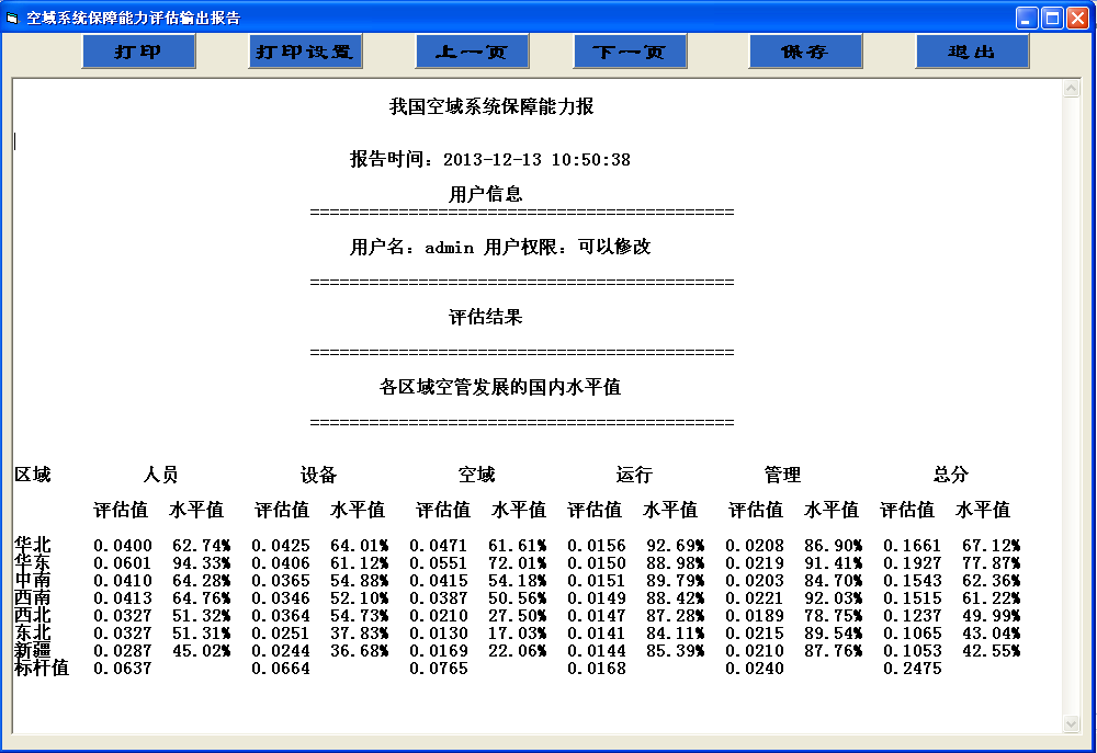 空域系统保障能力评估软件系统的指标权重可以读入默认值,也可以手动修改;按标准格式读入的调查问卷,系统可自动处理,采用层次分析法自动计算权重;系统可根据每个地区新输入的数据,自动计算空域系统保障能力和国内水平值;可对输入的权重的一致性进行自动检查;可自动输出评估报告。