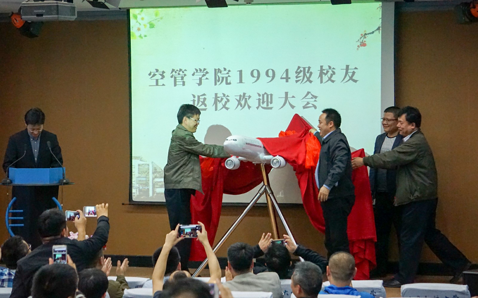 最后我校代表吴仁彪副校长、江平书记与两位校友代表共同为校友捐赠的飞机模型揭幕,一架正在起航的飞机,代表的是所有空管94级校友们对母校深深的祝福,每一位校友都希望母校在未来的时代里能够创造更有优秀的成绩,承担起引领民航业未来发展的使命!