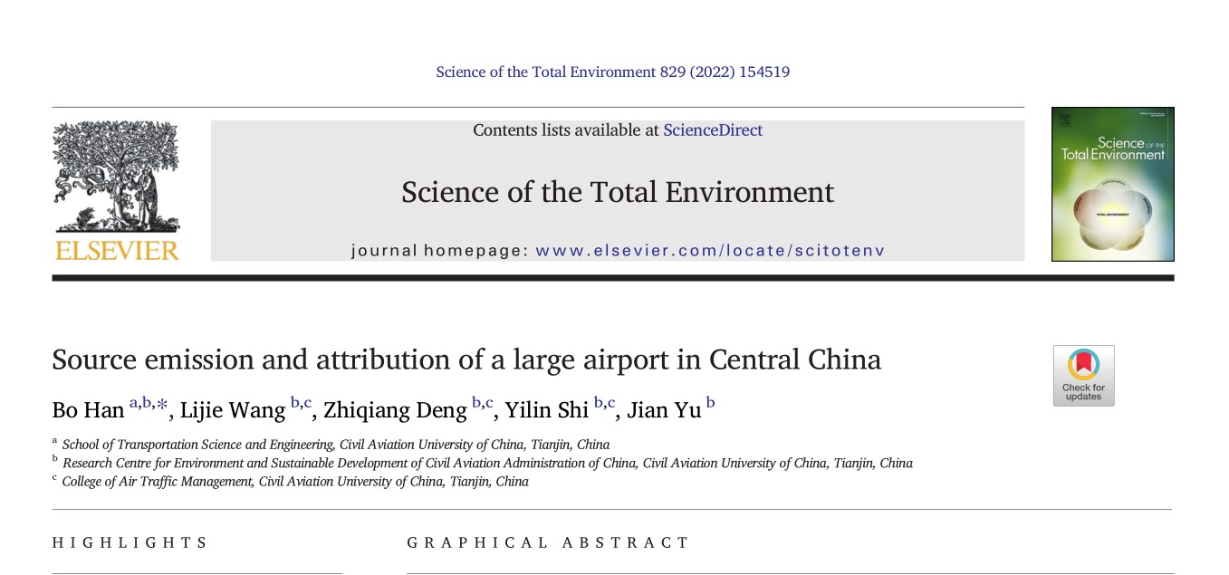 近日,《Science of The Total Environment》期刊发表了一项来自我校科研团队的最新成果,题目为“Source emission and attribution of a large airport in Central China”,期刊为JCR Q1分区,影响因子10.753。该论文的作者包括韩博、王立婕、邓志强、石依琳、于剑,其中王立婕、邓志强、石依琳三位主要作者为我院2019、2020级在读研究生,第一/通讯作者韩博副教授为学生指导教师。