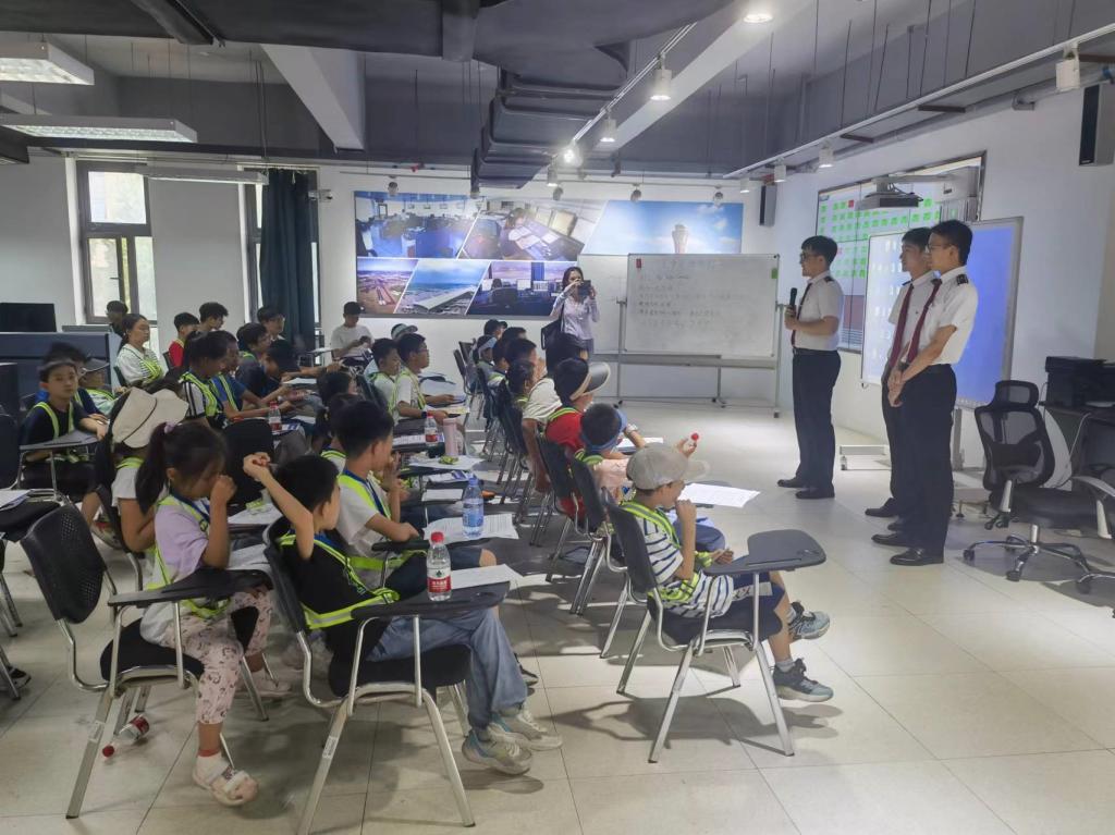 孩子们踊跃填写民航知识问答小册子,讲解员的生动讲解激发了他们对民航知识的浓厚兴趣。孩子们的热情参与让活动充满活力,他们在互动中收获了宝贵的体验。