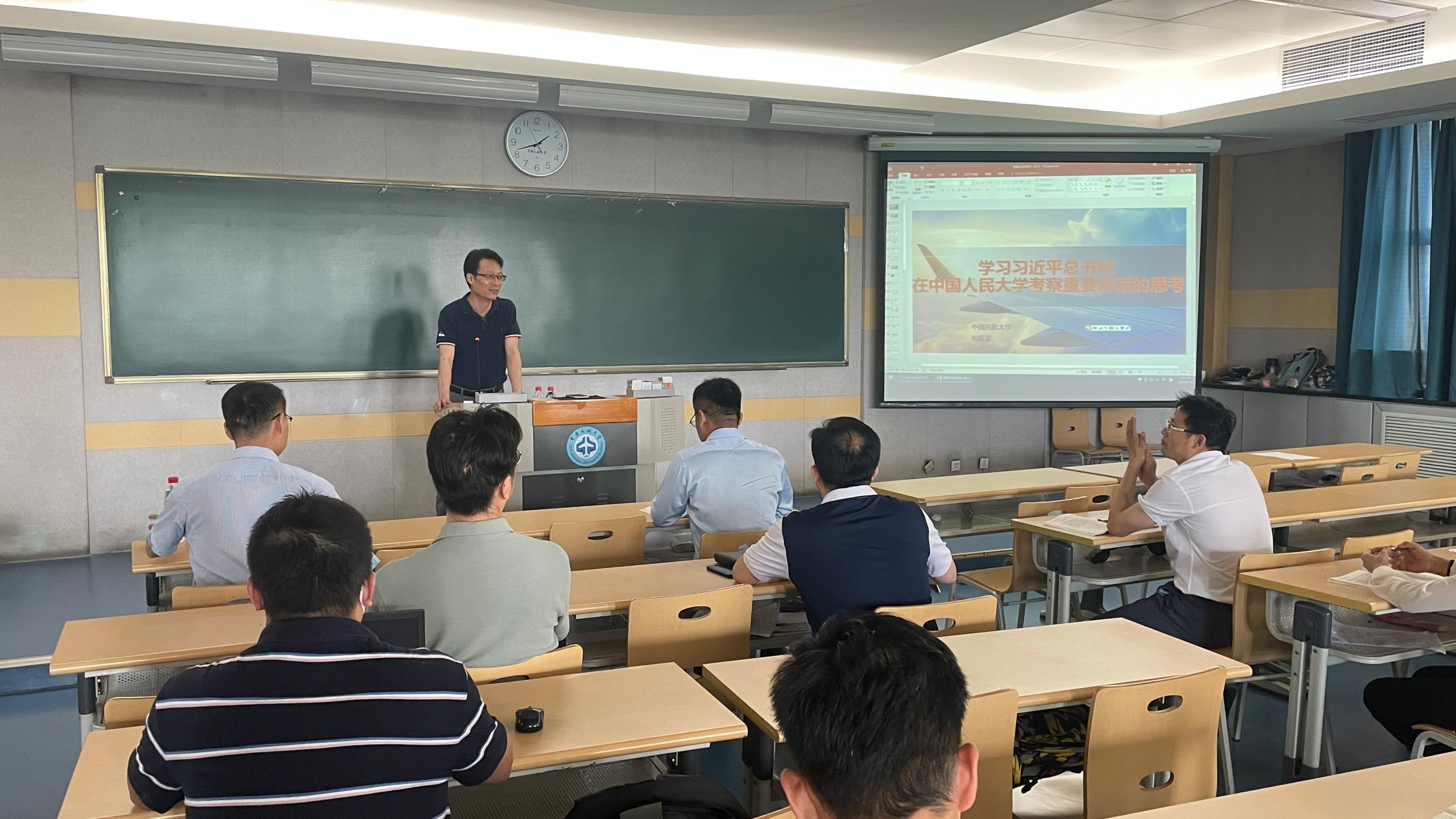 杨副校长以深入学习贯彻习近平总书记在中国人民大学考察调研时重要讲话精神的思考为主题,结合学校工作实际为与会人员讲授党课。他从建设中国特色、世界一流大学的新路;航空运输业面临的挑战及应对;民族工业面临的挑战及应对;大学面临的形势及应对等四个方面深入剖析习近平总书记重要讲话精神的深刻内涵。他强调,建设中国特色、世界一流大学不能跟在别人后面依样画葫芦,要扎根中国大地,走出一条建设中国特色、世界一流大学的新路,广大教师要争做“经师”和“人师”的统一者,塑造一支优秀教师队伍,讲好“大课程”,答好“大命题”,勇当开路先锋,争当事业闯将。尤其是面对“百年变局和世纪疫情相互交织,国际形势继续发生深刻复杂变化,世界进入新的动荡变革期,导致风险挑战增多,我国经济发展环境的复杂性、严峻性、不确定性上升”这种情况下,中航大人更要摆脱路径依赖,秉承创新这第一动力,谋求发展这第一要务,以“非常之为”求生存,以“非常之智”谋发展,以“非常之力”推改革,从感觉良好中惊醒起来,从安于现状中振作起来,从争先恐后中行动起来,踔厉奋发、勇毅前进,用实际行动“为党育人、为国育才”,为民航强国建设作出应有的贡献。