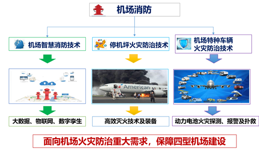 面向机场火灾防治重大需求,研发机场智慧消防技术、停机坪火灾防治技术、机场特种车辆火灾防治技术,保障四型机场建设。具体研究内容包括大数据、物联网、数字孪生;高效灭火技术及装备;动力电池火灾探测、报警及扑救。