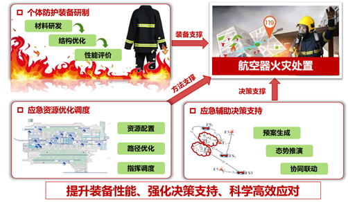 研究内容包括个体防护装备研制、应急资源优化调度、应急辅助决策支持,从而提升装备性能、强化决策支持、科学高效应对,通过装备支撑、方法支撑、决策支撑以实现航空器火灾的科学处置。