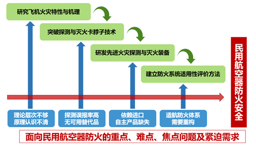 面向民用航空器防火的重点、难点、焦点问题及紧迫需求,研究飞机火灾特性与机理、突破探测与灭火卡脖子技术、研发先进火灾探测与灭火装备、建立防火系统适用性评价方法,实现民用航空器防火安全。