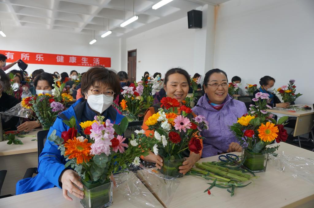 活动开始,花艺师为大家讲解鲜花常识、插花技巧、色彩搭配等知识,接着进行裁剪示范,演示插花步骤。大家对花艺有了初步的了解。工作人员为每人发放了一份插花材料,在花艺师的现场指导下,大家兴致勃勃的制作着花束,恣意享受着指尖绽放的浪漫和亲手创作的乐趣。老同志们相互交流,讨论着花束的高低、色彩搭配。不到一小时,一个个层次丰富、生机勃勃的作品就呈现出来。活动现场气氛热烈、欢声笑语。活动最后,老同志们纷纷拿着亲自制作的花束合影留念,定格最美瞬间。
