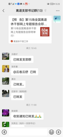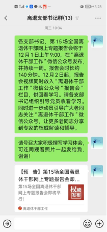 会前,离退处通过“离退休支部书记”微信群发布学习通知和预告链接,号召广大离退休党员通过“离退休干部工作”微信公众号准时观看学习,畅谈学习体会。
