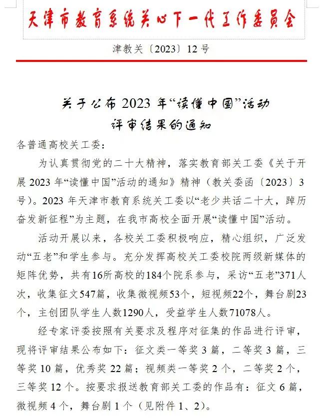 近日,在天津市教育系统关工委2023年以“老少共话二十大,踔厉奋发新征程”为主题的“读懂中国”活动中,天津市16所高校的184个院系参与。