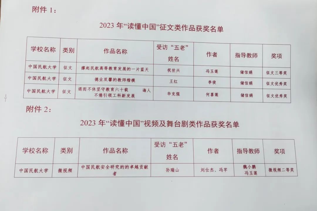 经专家评委按照有关要求及程序对征集的作品进行评审,经津教关〔2023〕12号颁布,我校《中国民航安全研究的的卓越贡献者——孙瑞山》获得视频类二等奖,《撑起民航高等教育发展的一片蓝天——祝世兴》获得征文类三等奖,《德业双馨的教师楷模-王红》《退而不休坚守教育六十载 诲人不倦引领工科新发展-华克强》获得优秀奖。