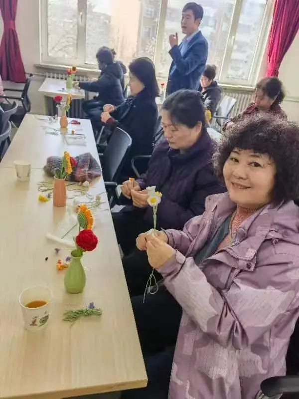 同时为了营造快乐的节日气氛,离退处邀请2022冬奥会毛线花参与制作者马老师开展了手工现场制作花束。马老师对大家如何进行“毛线花”的半加工,即如何将花瓣有机编制在一起进行了悉心指导。当一朵朵向日葵、玫瑰花、蓝玲花编织在一起时,女教工们脸上洋溢出幸福和骄傲的微笑,手工花制作提高了大家的动手和艺术审美能力,更陶冶活跃了节日的气氛。王顶堤党支部在金厦里组织开展了手工花制作。在马老师指导下,大家纷纷拿起手中的材料开始造型设计、色彩搭配、整体定型……在活动中,大家边制作边交流,现场欢歌笑语气氛活跃。三八妇女节中,大家手捧花束合影留念,定格最美的时刻记录美丽的芳华。