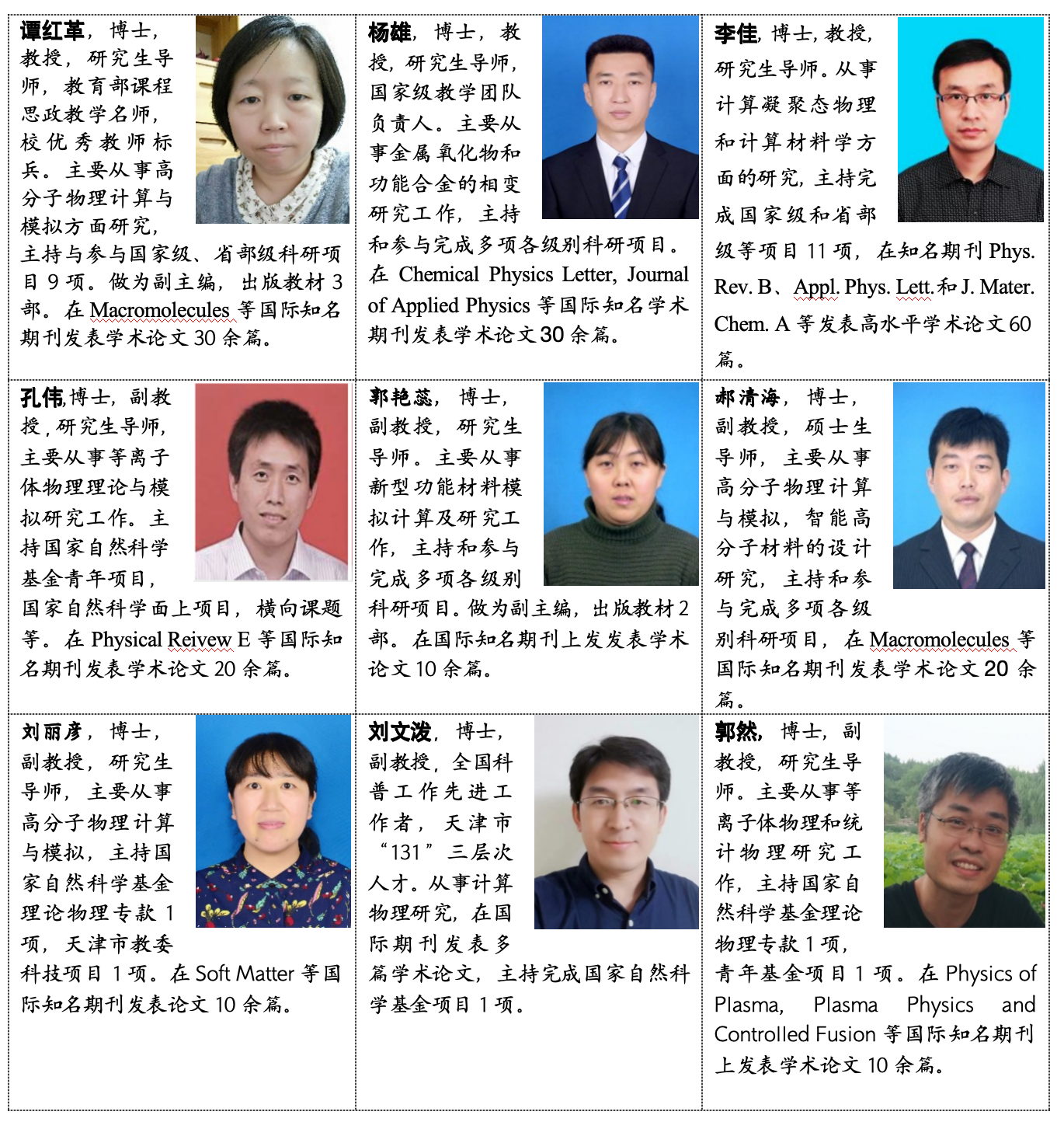 团队带头人谭红革教授,成员13人。正高级职称3人,副高级职称7人,中级3人。博士学位占100%。其中,教育部课程思政教学名师3人,全国科普工作先进工作者1人,天津市131创新型人才1人,校蓝天教学名师1人,校骨干教师3人。本团队教师主持和参与国家级、省部级科研项目30余项。