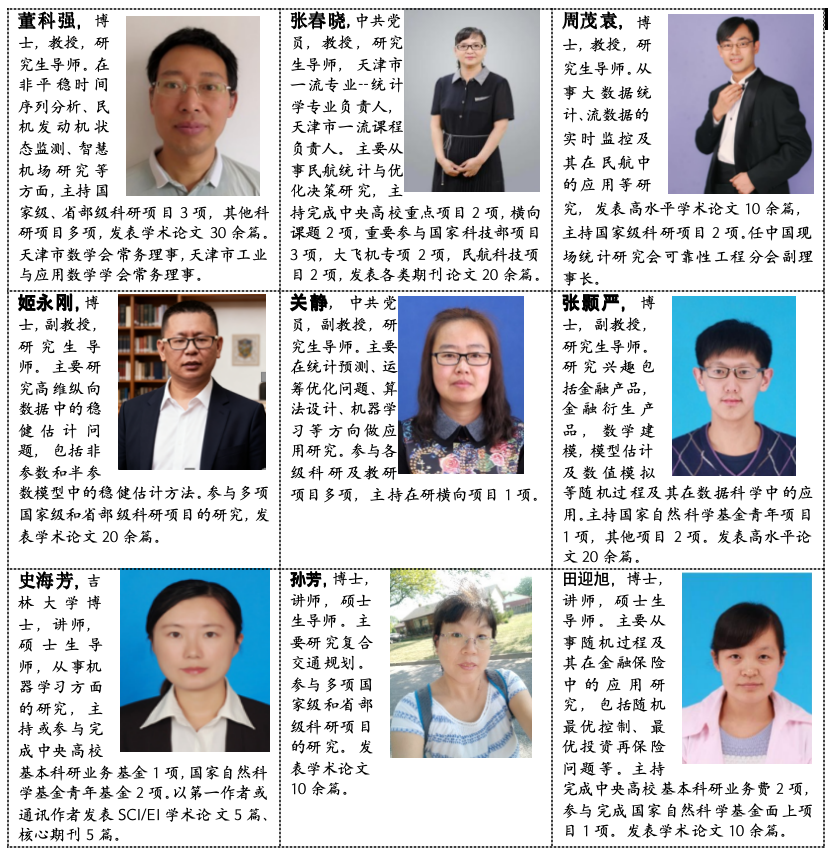 团队带头人董科强教授,成员17人,其中教授3人,副教授4人,讲师10人。团队成员的专业背景涉及概率论与数理统计、数理经济、运筹学与控制论及应用等学科方向,有利于实现学科间的深度交叉。本团队教师主持国家级、省部级和横向科研项目20余项。