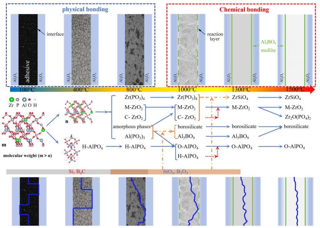 近日,中国民航大学理学院耐高温与阻燃材料实验室王明超副教授团队在氧化铝陶瓷专用高强度耐高温胶的研发方面取得显著成果,所研发的热膨胀性能可调的锆改性磷酸铝基耐高温胶可为氧化铝陶瓷提供超60MPa的连接强度,相关成果以“The preparation and performance analysis of zirconium-modified aluminum phosphate-based high-temperature (RT-1500°C) resistant adhesive for joining alumina in extreme environment”发表在《Journal of Advanced Ceramics》。
