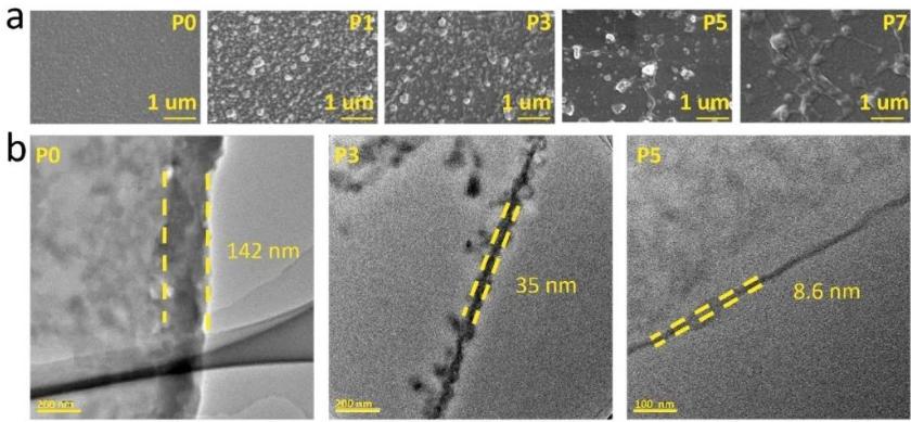 图1. (a)不同浓度的PVP添加剂对膜表面结构的影响 (b)不同浓度的PVP添加量制备的聚酰胺膜厚度