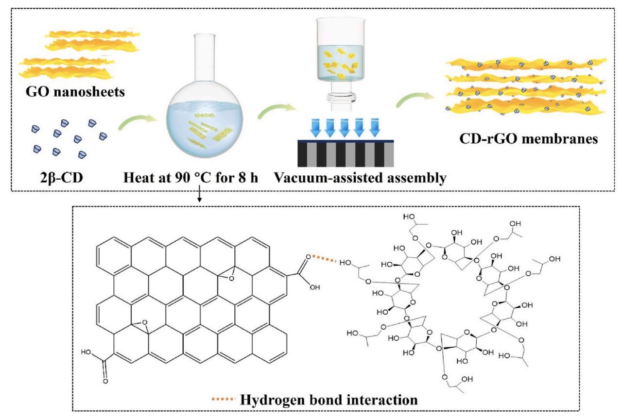 本研究证明了采用掺杂和还原策略可以提高CD-rGO纳米过滤膜的性能和稳定性。通过详细的实验设置,将2β-CD掺入GO纳米片并通过热处理进行还原。通过红外光谱的位移证实了2β-CD与GO之间氢键的形成,这一作用在稳定膜结构中起到了关键作用。我们的研究结果表明,2β-CD的掺入不仅扩大了层间距,还利用其固有的孔隙度促进了水的传输,显著提高了膜的亲水性和操作稳定性。优化后的CD-rGO膜含有40微克的纳米片混合物,展现出卓越的性能,水通量为96.9 L m−2 h−1 bar−1。对于MB、EBT和GR,CD-rGO膜的染料截留率分别达到98.5%、99.3%和99.5%。CD-rGO膜的耐久性也得到了显著改善,在长时间的超声波测试下未出现任何缺陷,与GO、rGO和CD/GO膜形成了鲜明对比。此外,CD-rGO膜在交叉流过滤试验中也展现出了压力和长期稳定性。这些结果强调了双重掺杂还原策略在制造坚固、高性能纳滤膜方面的潜力,这些膜适用于包括水处理和净化在内的各种分离技术。
