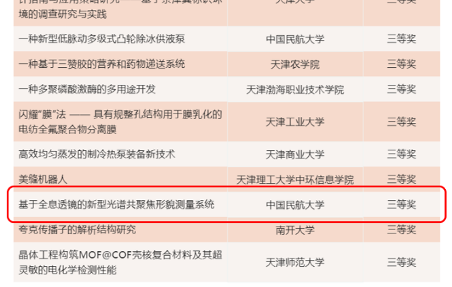 4月12日第十七届“挑战杯”全国大学生课外学术科技作品竞赛暨“科创先行 强国有我”网络主题活动圆满落幕。以中国民航大学理学院本科生刘洋钰为团队负责人,理学院刘鸿鹏、李立两位教师为指导教师的国创参赛项目——“基于全息透镜的新型光谱共聚焦形貌测量系统”,在“挑战杯”全国大学生课外学术科技作品竞赛中斩获国家级三等奖、第十六届“挑战杯”中国银行天津市大学生课外学生科技作品竞赛中斩获特等奖,团队完成的国创项目成功入选并参展“第十四届全国大学生创新创业年会”(全校仅两项)。同时,由该项目所演化的创业类商业竞赛项目,经我院本科生智安通精心组织,在第七届中国国际“互联网+”大学生创新创业大赛中获得国家级三等奖、天津市金奖的好成绩,实现了学校在该项赛事国家级奖项的重大突破。