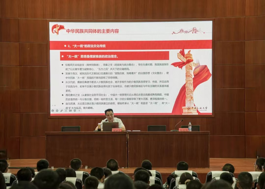 最后邓书记为全体新生带来“中华民族共同体意识的形式与铸牢”主题讲座。邓书记从中华民族共同体意识的概念与本质引入,通过丰富详实的事例以及娓娓道来的话语向同学们讲述了在新时代,铸牢中华民族共同体意识有助于维护国家统一和民族团结,实现中华民族伟大复兴的中国梦的深刻道理。