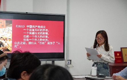 活动现场阶段:踔厉今朝,直抒胸臆新征程。支部书记梁恬怡以PPT形式带领全体成员回顾了这一个月以来的学习历程。随后通过短视频的形式带大家重温党的二十大报告,重点关注了与支部毕业生党员同志息息相关的就业、租房等政策。会上,支部成员分为四组,通过演讲的形式表达了自己小组对聆听前路、踔厉今朝的感悟。从对电影的感受,到自己在面对科研、就业时所面对的焦虑,体现了重温建党历程对青年人的影响之大。