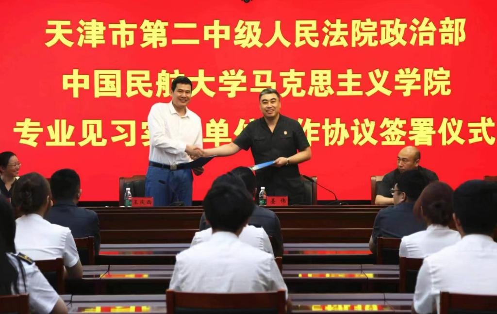 为了不断增进高等院校与人民法院的深度交流合作,打造学校与社会间的桥梁,提高学生的社会适应能力,为择业就业打下良好基础。2024年6月24日上午,中国民航大学马克思主义学院与天津市第二中级人民法院举行签订见习实践单位合作协议仪式,在掌声中,二中院组宣处党支部的姜伟同志与马克思主义学院领导王庆西签订并交换协议,标志着本阶段的见习实践正式拉开序幕。