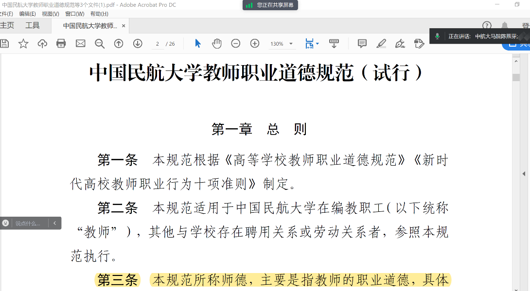支部书记陈燕芽结合思政课教师工作实际,领学了《中国共产党纪律处分条例》第三章第十七条至第二十七条内容,组织全体教师逐条学习了《中国民航大学教师职业道德规范(试行)》《中国民航大学师德失范行为处理办法(试行)》《中国民航大学教师师德考核办法(试行)》等文件,并以违反教师职业行为十项准则典型案例为抓手进行警示教育,呼吁全体教师要知敬畏、存戒惧、守底线,做到防微杜渐,以案为鉴。
