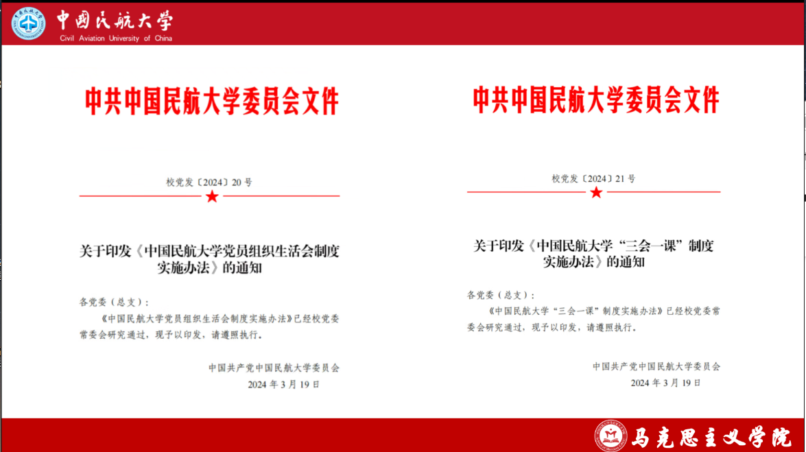 第二,形势与政策教研室党支部书记瞿琼老师以“规范组织生活 筑牢战斗堡垒”为题,领学《中国民航大学“三会一课”制度实施办法》《中国民航大学党员组织生活会制度实施办法》等文件。瞿老师系统梳理了党员大会、支委会、党课、主题党日、组织生活会等党员组织生活的程序和要求,并强调了党支部会议记录的规范性要求。