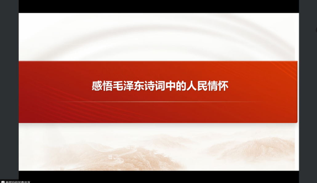 之后,娄梦玲和陈燕芽两位老师讲党课。娄梦玲老师以“感悟毛泽东诗词中的人民情怀”为题,以毛泽东诗词为牵引,从“对人民境遇充满感情”“对人民力量热情礼赞”和“对人民主体性真诚讴歌”三个方面带领大家领略了毛泽东同志深厚炽热的人民情怀。