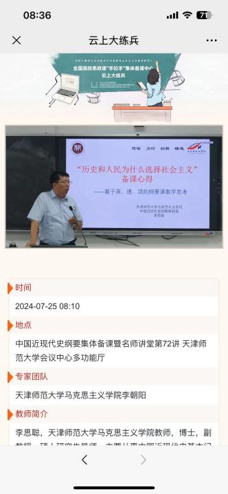 本次集体备课主要围绕着教材第八章之“社会主义道路:历史和人民的选择”来进行,由天津师范大学李思聪老师主讲,主要分享他在讲授本章内容时的一些经验。
