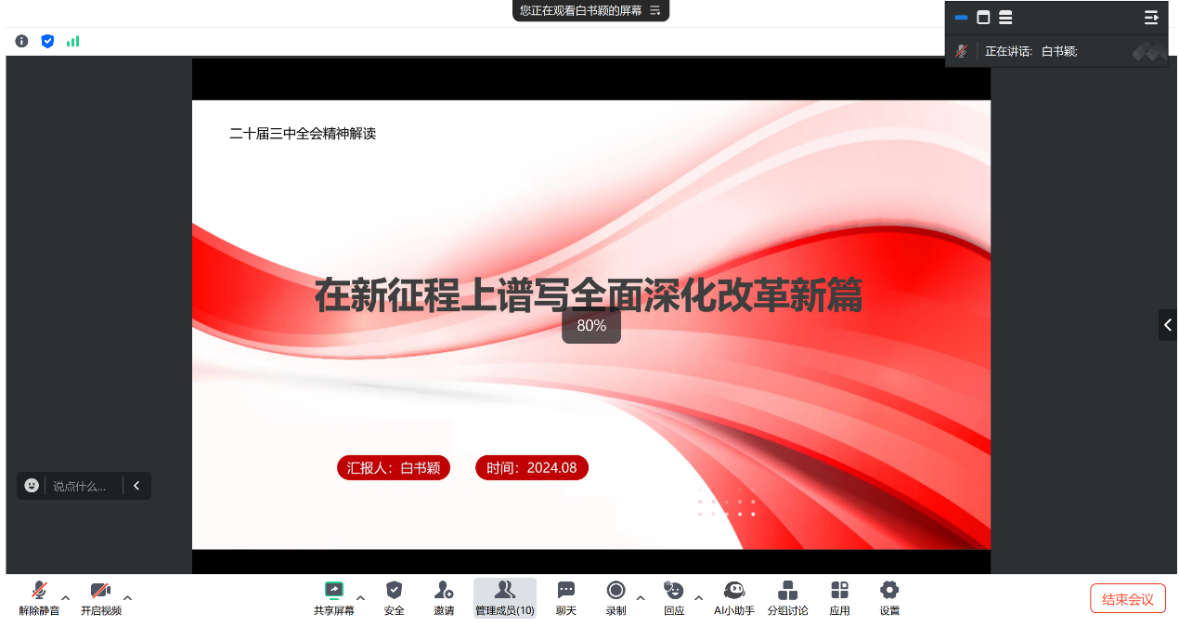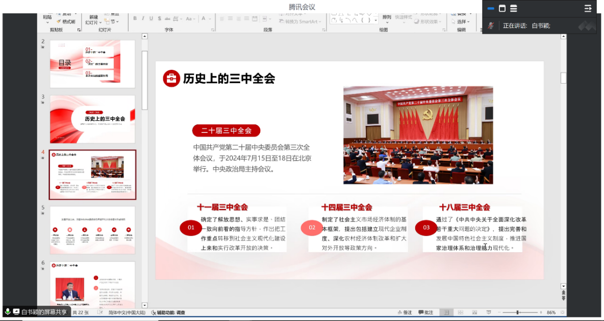 白书颖老师围绕党的二十届三中全会精神讲授主题党课。她结合党的历史上历届三中全会的重要历史地位和党的二十届三中全会召开背景深刻阐释了此次会议的重要地位,并从会议主题、进一步深化改革的总目标、重大原则、重大举措、根本保证等方面内容进行了系统梳理,在此基础上,白书颖通过结合、对比党的二十大精神等内容,对党的二十届三中全会的新思想、新观点、新论述进行了重点解读。