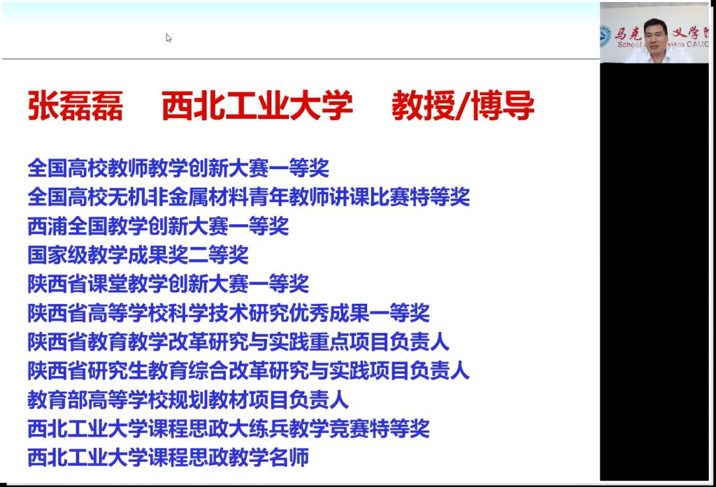 本次讲座邀请到荣获第四届全国高校教师教学创新大赛课程思政正高组一等奖的西北工业大学材料学院教授张磊磊担任主讲嘉宾,主题为“航空航天类课程思政的元素挖掘与融入策略”,并详细探讨了如何挖掘课程思政元素,如何系统性地融入课程思政,以及如何在专业课教学中进行课程思政。