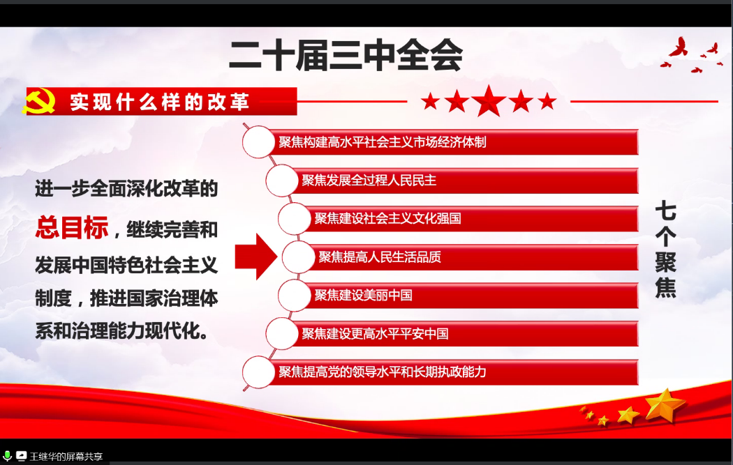 会上,支部党员王继华老师领学党的二十届三中全会精神,重点谈在新征程上实现什么样的改革,怎样全面深化改革这一重大问题,并梳理了改革开放以来党的历届三中全会的关键内容,阐述从面对纷繁复杂的国际国内形势、面对新一轮科技革命和产业变革和面对人民群众新期待等三个方面聚焦七个领域如何继续把改革推向前进。