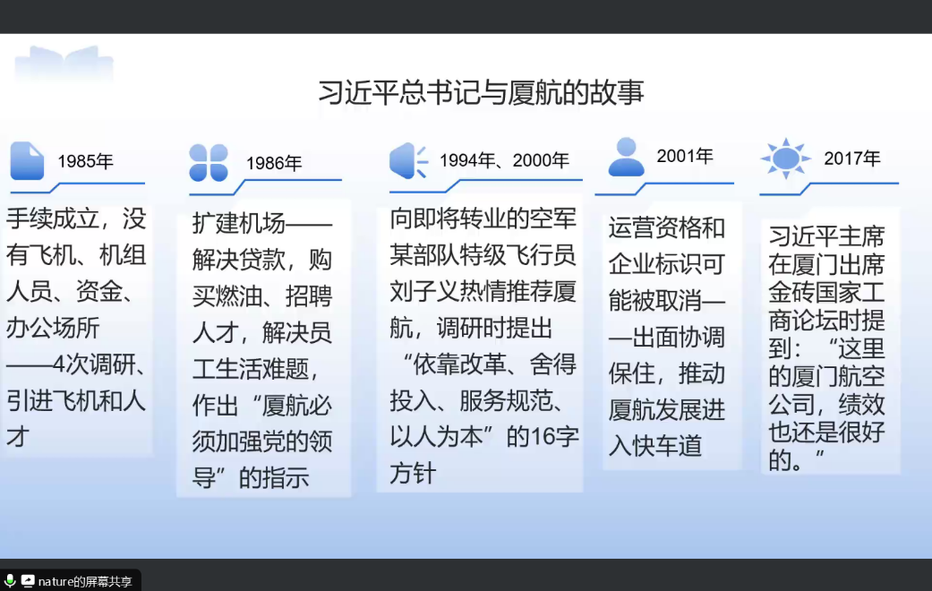 支部党员赵英杰老师领学《习近平给厦门航空有限公司全体员工回信》。她从回信的内容,习近平总书记和厦航的故事,学习贯彻落实习近平总书记重要回信精神等三个方面展开分享。根据时间线梳理习近平总书记与厦航的故事,分享了民航局党组和厦门航空如何学习贯彻习近平总书记的重要回信精神,最后重点谈作为思政课教师如何学习领会习近平总书记重要回信精神。