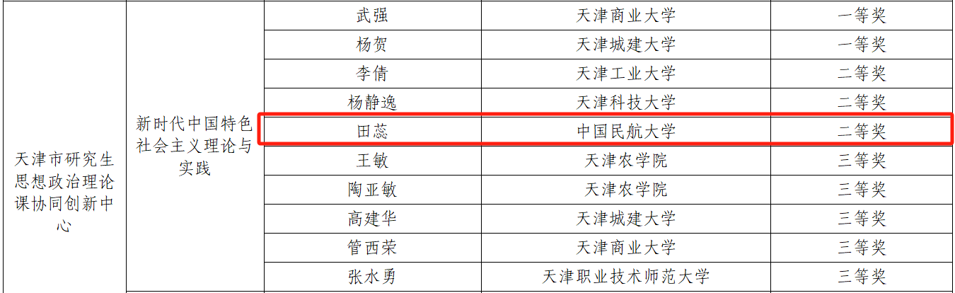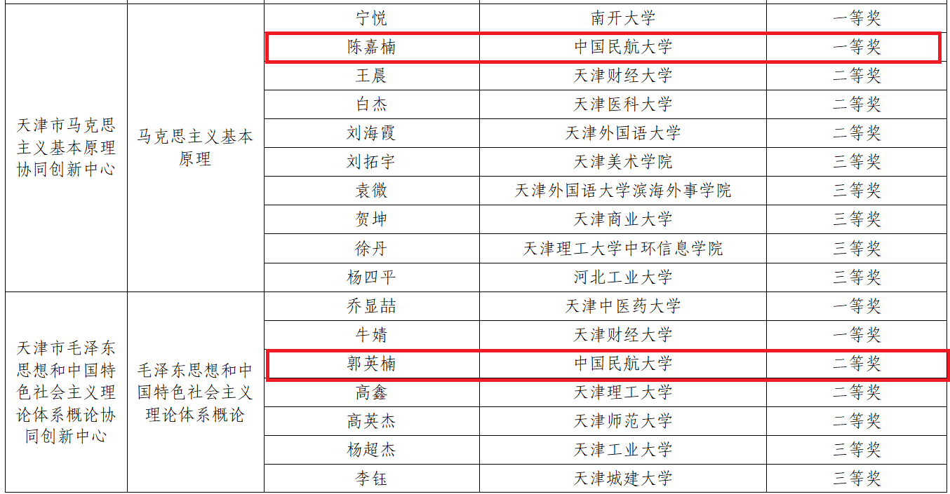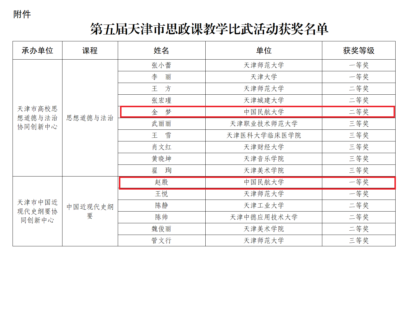 近日,天津市教委、市教育工委公布天津市第五届思政课教学比武获奖名单,中国民航大学6名思政课教师获得一、二等奖。其中3名教师在《中国近现代史纲要》《马克思主义基本原理》《形势与政策》课程教学比武中荣获一等奖,3名教师在《思想道德与法治》《毛泽东思想和中国特色社会主义理论体系概论》《新时代中国特色社会主义理论与实践》课程教学比武中荣获二等奖。