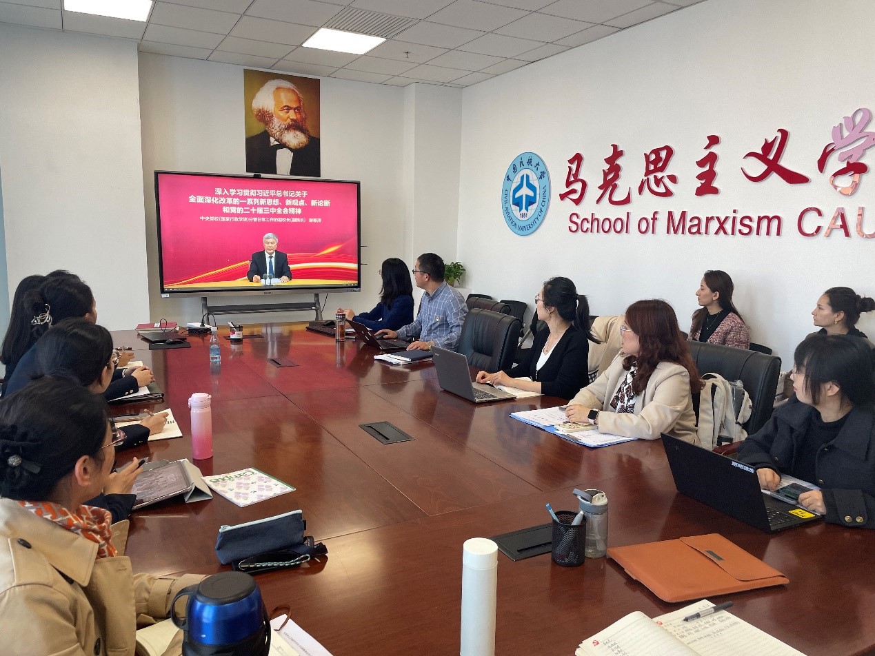 随后,党支部书记陈慧军老师带领全体党员同志共同学习了中央党校副校长谢春涛教授关于“深入学习贯彻习近平总书记关于全面深化改革的一系列新思想、新观点、新论断和党的二十届三中全会精神”的讲座,与会教师党员结合教学谈感受。教师党员梁镜源表示:“本学期在讲授《习近平新时代中国特色社会主义思想概论》这门课的过程中,时刻与时政信息相结合,将党的二十届三中全会精神贯彻落实到课堂上,从中国式现代化视角出发,为学生讲述现代化的五大特征,使学生充分认识到社会主义现代化强国目标实现的必要性和当代价值意蕴。”