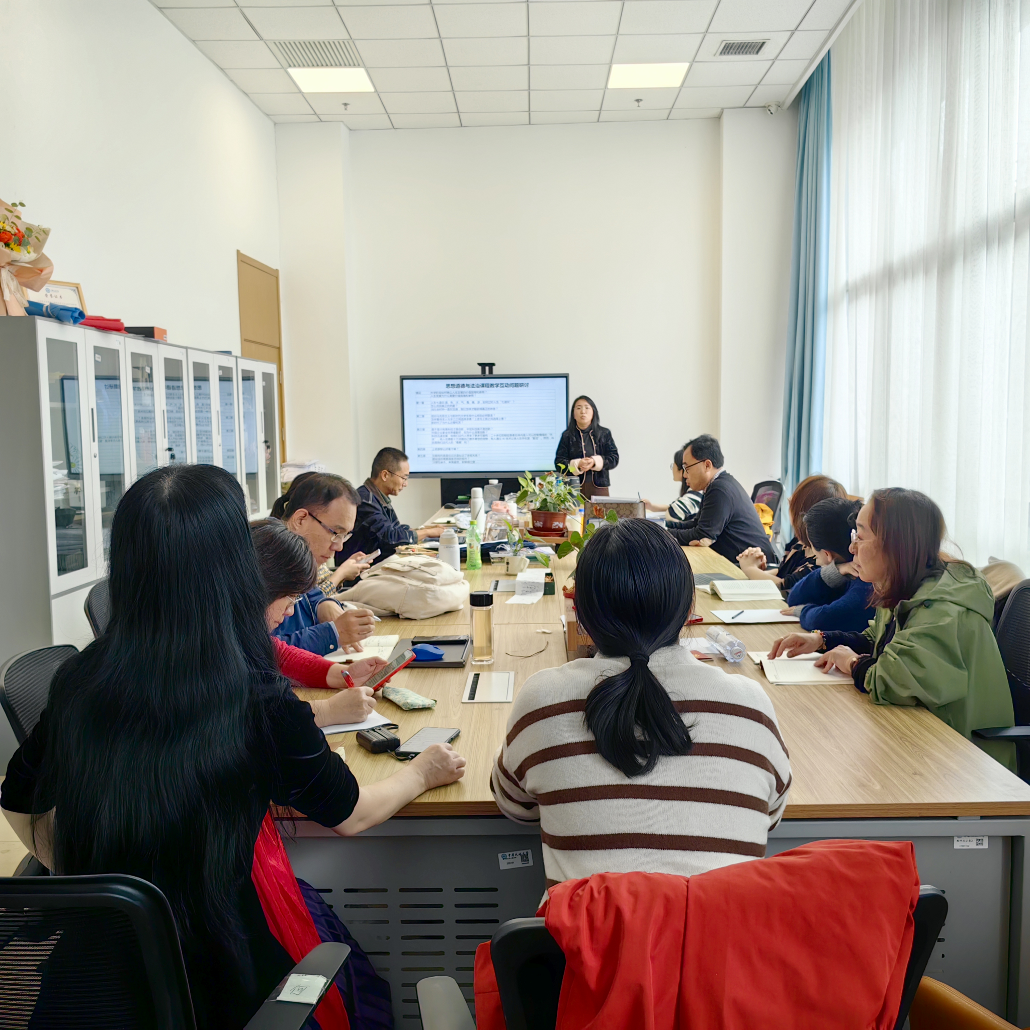 成竹雅老师首先针对思想道德与法治课程的每一章抛出了教学中的一些问题,如第三章中的“是不是只有高科技才是创新,中低科技就不是创新”、第五章的“互联网究竟是拉近了还是扯远了关系”等,教研室老师们展开了初步的研讨。