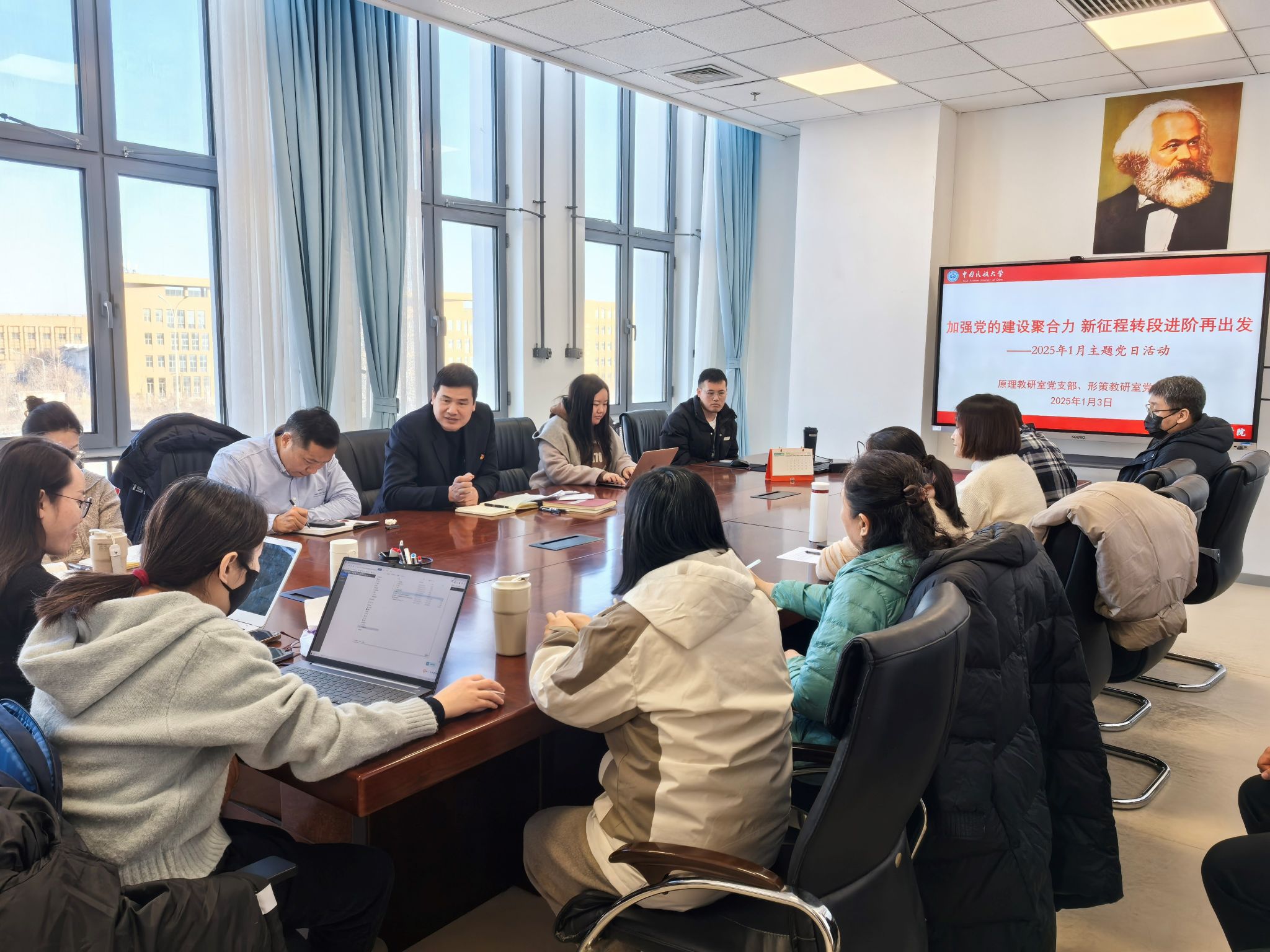 为加强党的建设,推动大党建和大思政建设,实现党建与业务的高质量融合,以饱满的精神状态迎接马克思主义学院转段进阶的新阶段,2025年1月3日,原理教研室党支部和形势与政策教研室党支部联合开展“加强党的建设聚合力,新征程转段进阶再出发”主题党日活动。本次活动由支部书记陈嘉楠、瞿琼同志主持,两个支部的全体党员积极参与。