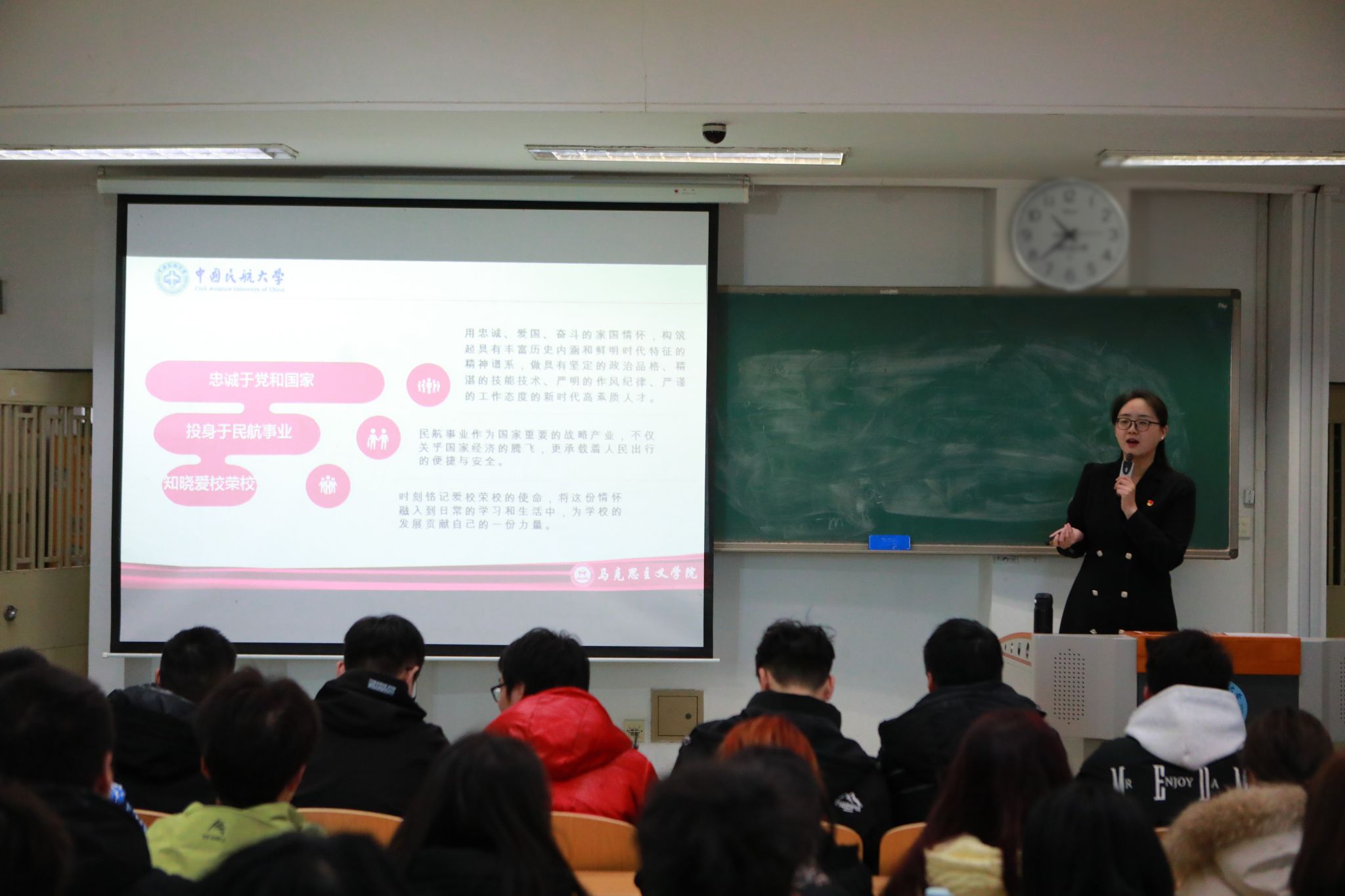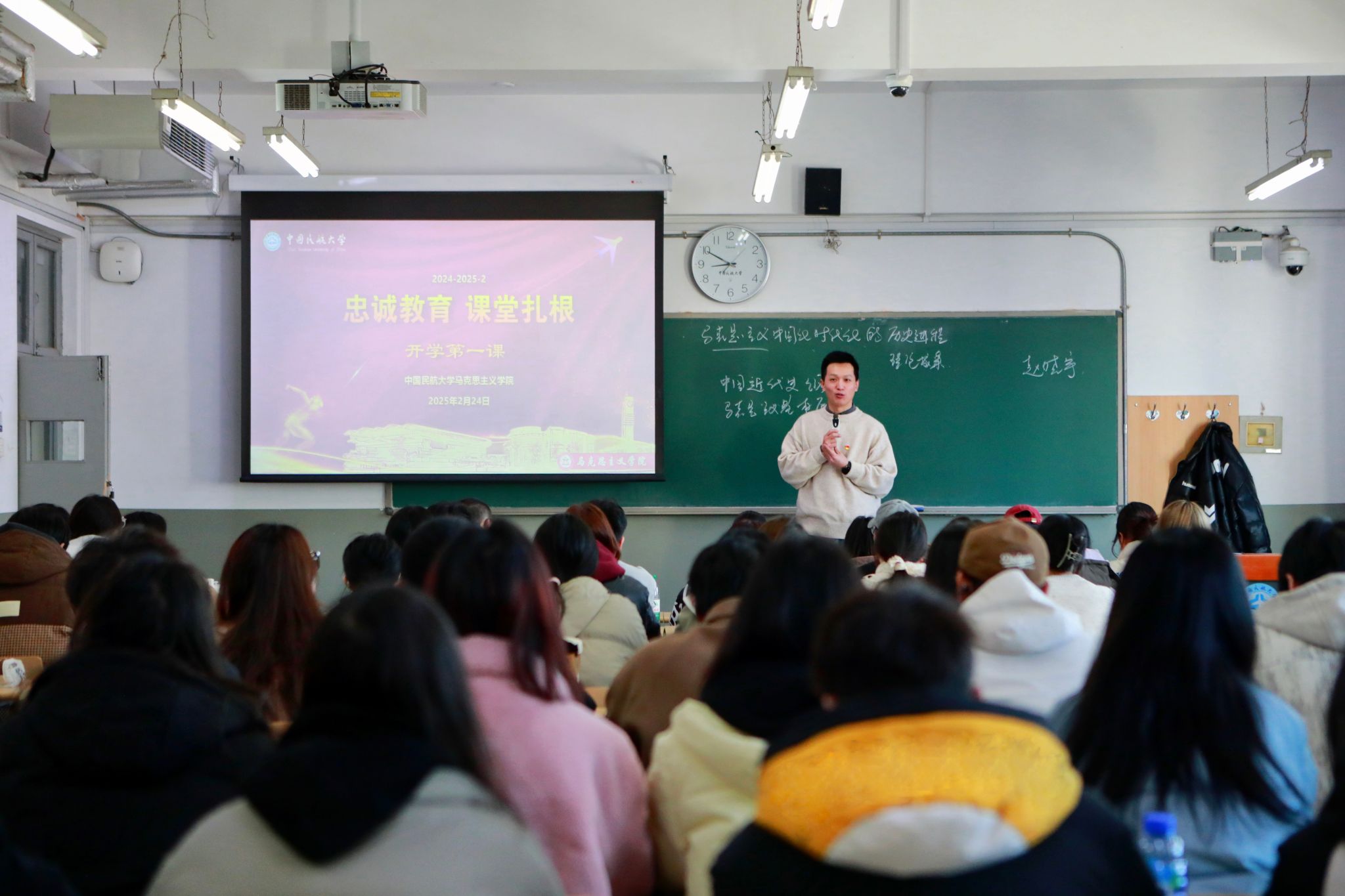 春风拂面启新程,忠诚铸魂育栋梁。2月24日,马克思主义学院以“忠诚教育,课堂扎根”为主题,为全校学生带来了意义深远的开学第一课。全体教师立足学科特色,深入学习领会习近平总书记最新重要讲话精神以及关于民航工作的重要指示批示精神,认真领会校党委提出的“1232”大思政课教育教学建设体系内涵和精髓,用忠诚于党和国家、投身民航事业、爱校荣校打开新学期思政殿堂,老师们通过理论讲授、案例研讨、师生互动等形式,引导青年学子忠字当头,筑牢信仰之基、补足精神之钙,坚定马克思主义信仰、中国特色社会主义信念和实现中华民族伟大复兴中国梦的信心。