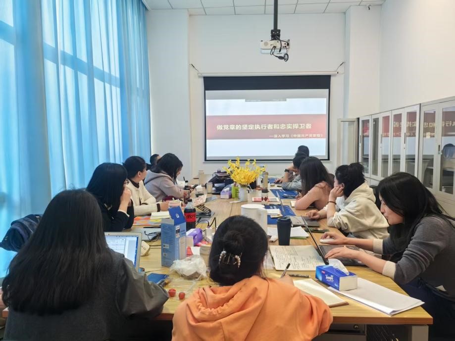 毛概教研室党支部陈燕芽同志以“做党章的坚定执行者和忠实捍卫者”为题带领全体与会党员深入学习《中国共产党章程》,鼓励支部党员自觉学习党章、模范遵守党章、坚决贯彻党章和维护党章,做党章的坚定执行者和忠实捍卫者,立足自身岗位扎实履行党员的职责和义务,为全面推进中国式现代化挺膺担当。