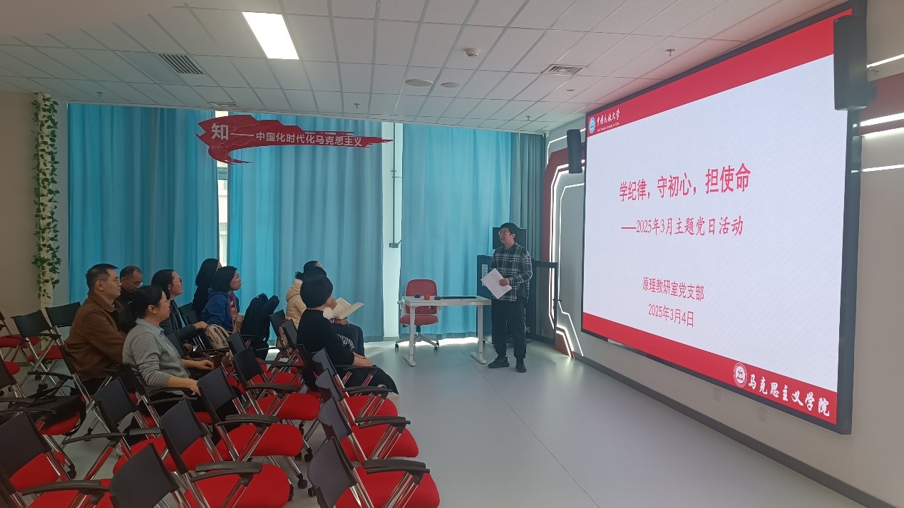 为进一步深入学习贯彻习近平新时代中国特色社会主义思想和党的二十届三中全会精神,巩固深化党纪学习教育成果,3月7日下午,原理教研室党支部在思政课沉浸式教学创新中心开展了“学纪律 守初心 担使命”主题党日活动。
