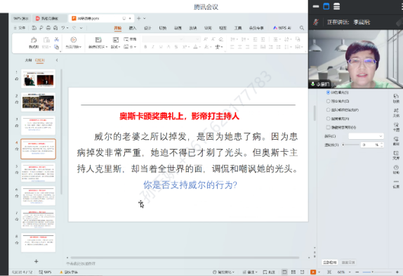 主讲人张可老师从人工智能和课程结合的角度分享了自己的认识。在分享中分析了人工智能相关热点新闻以及其发展过程、未来研究方向。在此基础上具体分析了生成式人工智能中深度伪造的问题和各国的法治实践,并与各位老师讨论了人工智能与科技向善、法治保障、国家安全、理想实现的特征、青年创新创造等课程内容的结合点。主讲人李晨阳老师分享了对于网络道德内容的讲解。通过奥斯卡颁奖典礼上影帝打主持人的案例进行分析,采取剥洋葱的方式层层深化信息,并用学习通进行5次学生立场的投票互动,分析几次支持率发生变化,引导学生正确使用网络工具,实现理论升华与价值观引领。