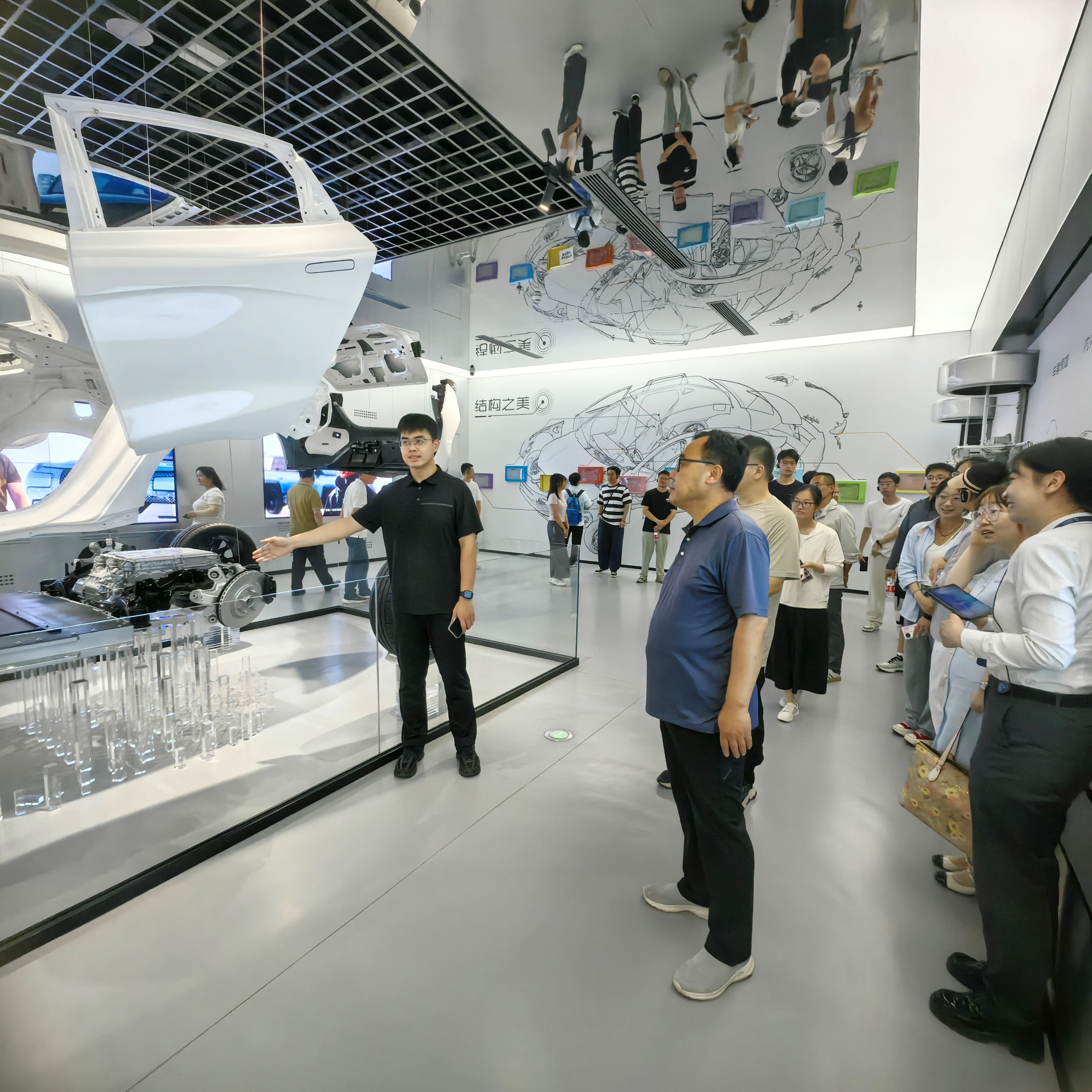 作为新一轮科技革命与产业变革的核心驱动力,人工智能深刻重塑着社会生产生活和教育形态。在迪空间,师生通过先进的模型展示与智能交互系统,深入了解比亚迪在DM-i超级混动技术,解析比亚迪的刀片电池,体验CTB电池车身一体化技术。学生们也把《自然辩证法概论》课堂的理论思辩直接带到实践场景。航空工程学院研究生常乐天在技术研讨中提出:“智慧交通的终极目标不应止步于单车智能的优化,必须运用系统论思维,秉持‘大交通、大安全’理念。人工智能的开发应用尤其需要强化‘集体主义’价值观,确保大数据和算法服务于整个交通网络的安全、效率与公平,避免技术孤岛。”安全学院研究生杨益涵则分享了其关于借鉴民航业“举手文化”保障智能交通安全的思考:“AI算法与算力的进步高度依赖高质量数据,构建公众志愿参与的交通安全隐患即时报告机制至关重要,这不仅是技术可靠性的基石,更是‘人民至上、生命至上’价值理念在智能交通领域的生动运用。”张馆长高度评价同学们的见解,表示将把其中蕴含的深刻思考带回给总部研发团队。