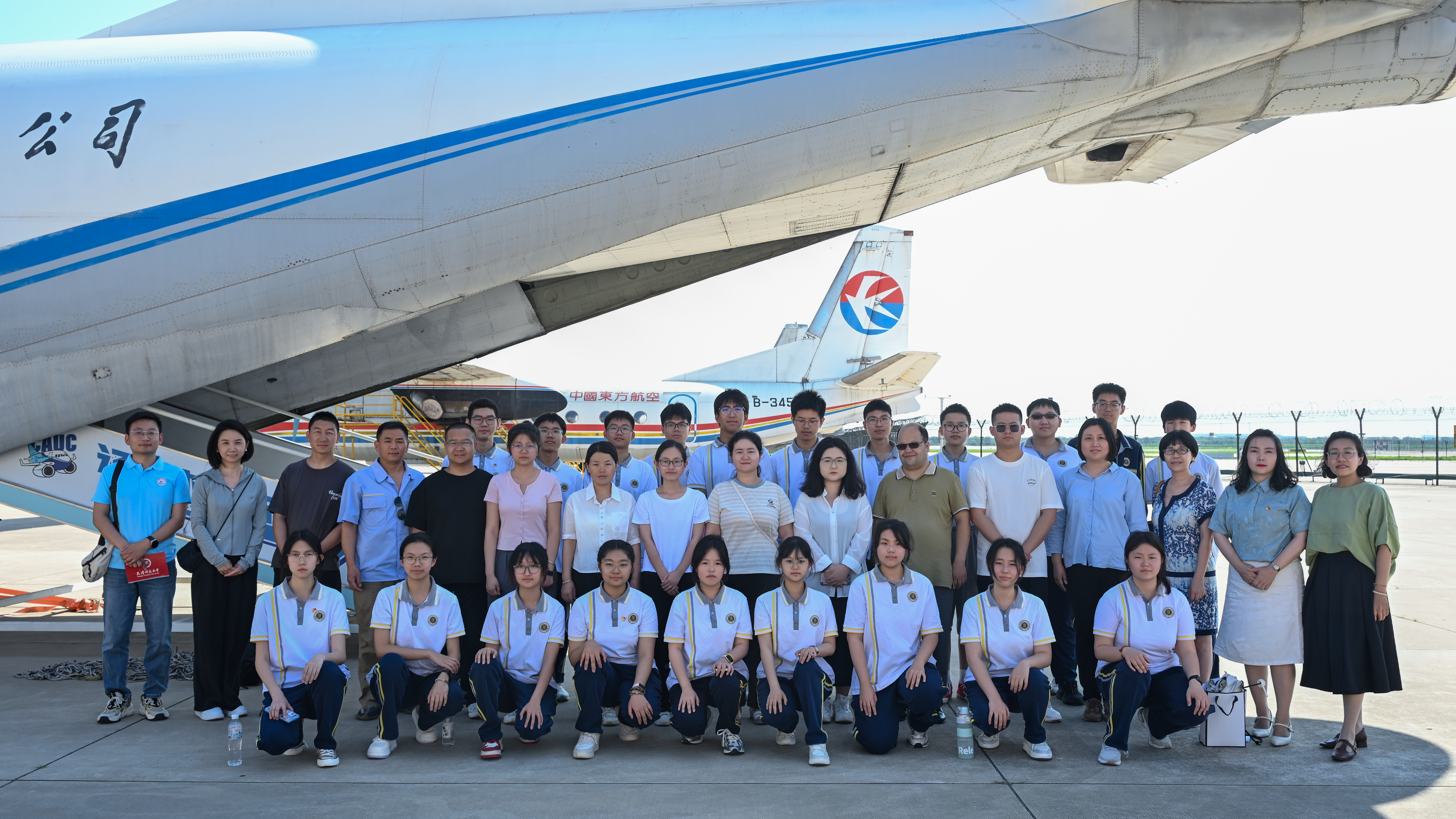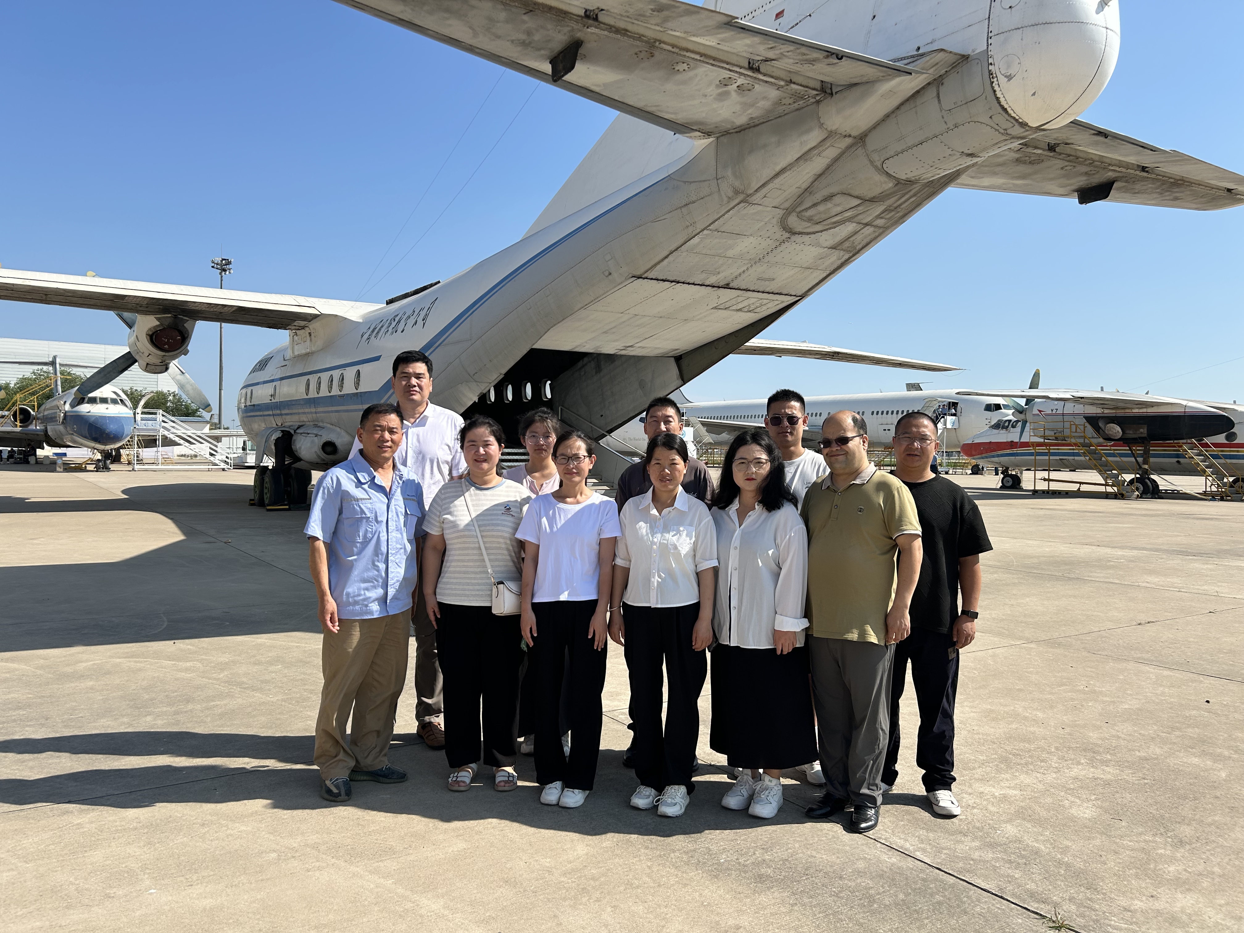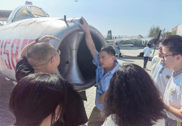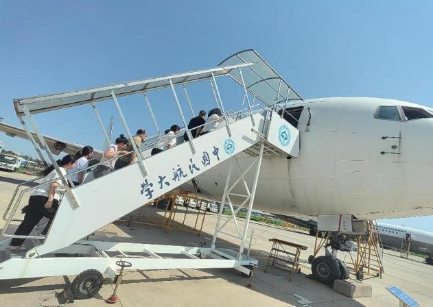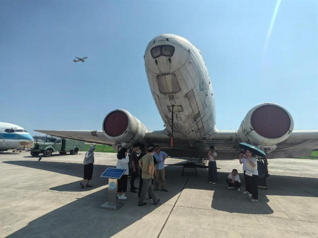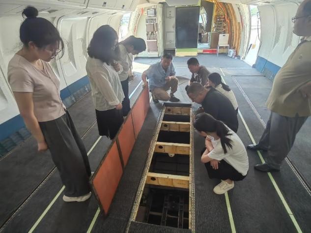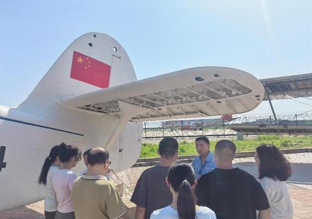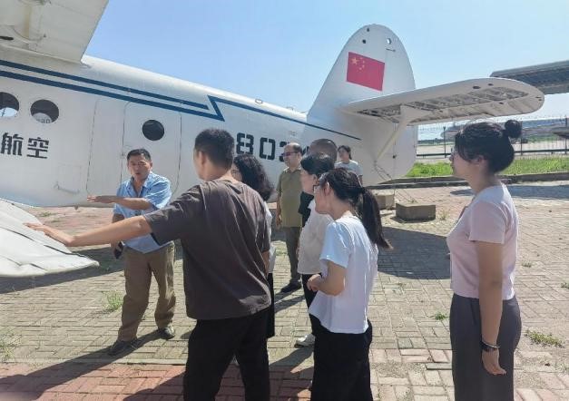 活动首站来到中国民航大学停机坪。这里不仅是教学实训基地,更是天津规模最大的露天飞机博物馆,20 余架不同型号的飞机静静陈列,宛如一部立体的中国民航发展史。现场老师结合实物,生动讲述了各型号飞机的研制背景、技术特点及我国民航事业从起步到腾飞的艰辛历程。从早期引进的机型到自主研发的新一代客机,每一架飞机都承载着中国航空人的奋斗故事。老师们和同学们近距离参观机身结构、驾驶舱布局,还获邀进入部分飞机内部亲身体验,直观感受我国民航工业的发展,深刻体会到 “航空报国” 精神在一代代从业者中的传承。