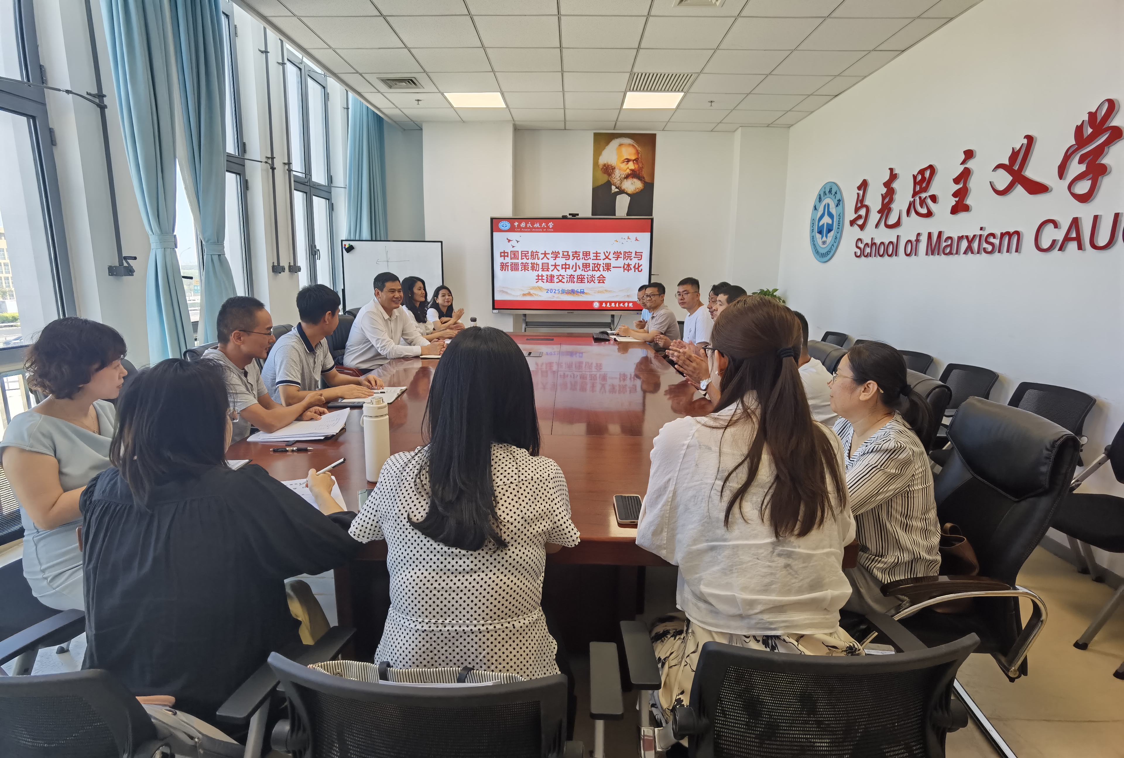就在古再丽努尔入学的同一天,由邢军老师指导、在策勒县首届“故事思政”微课大赛中获得一等奖的青年教师彭荣,正在为策勒县全体老师开展公开示范课。示范课结束后,彭荣将来到中国民航大学,开始这一期在马克思主义学院的跟班学习。
