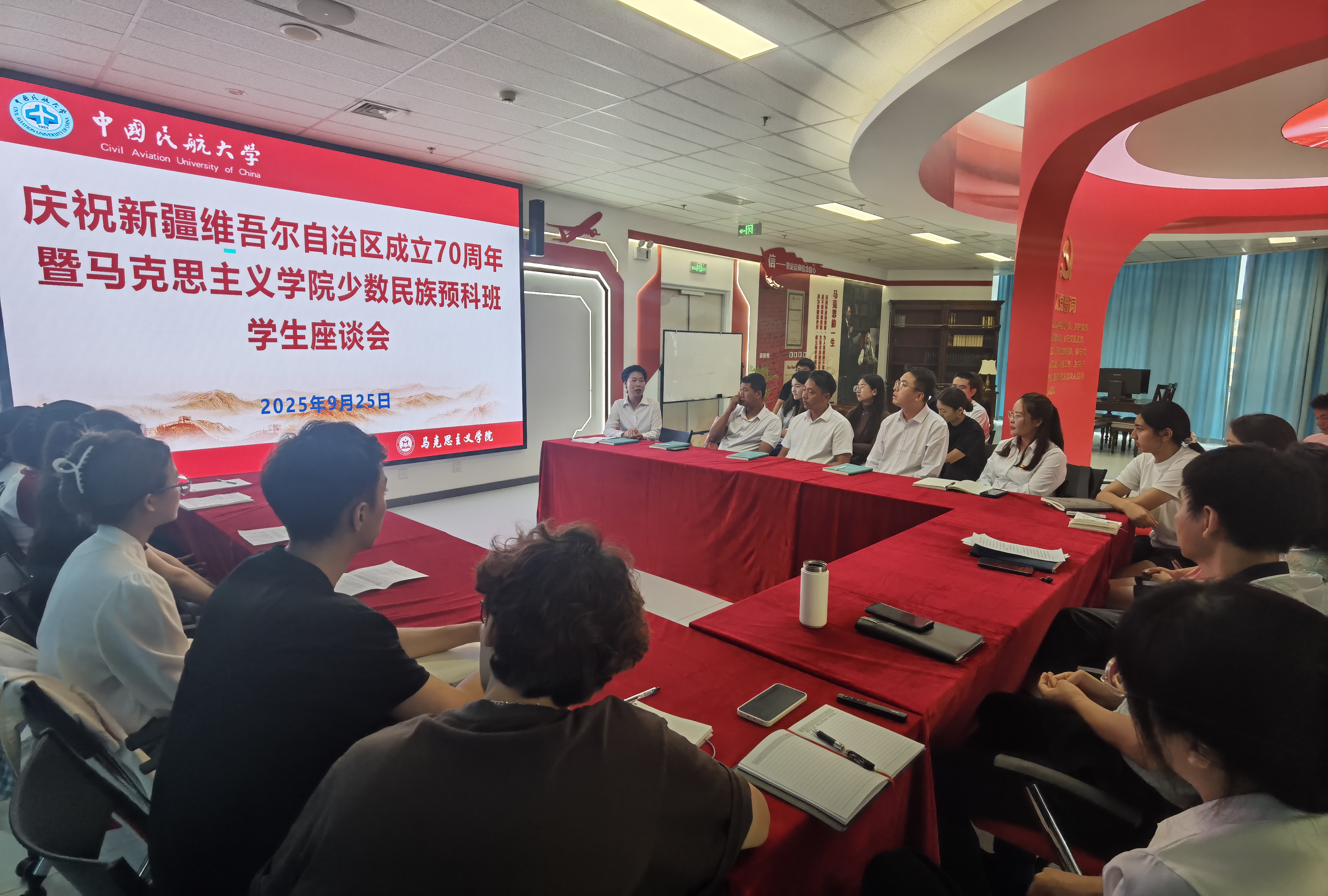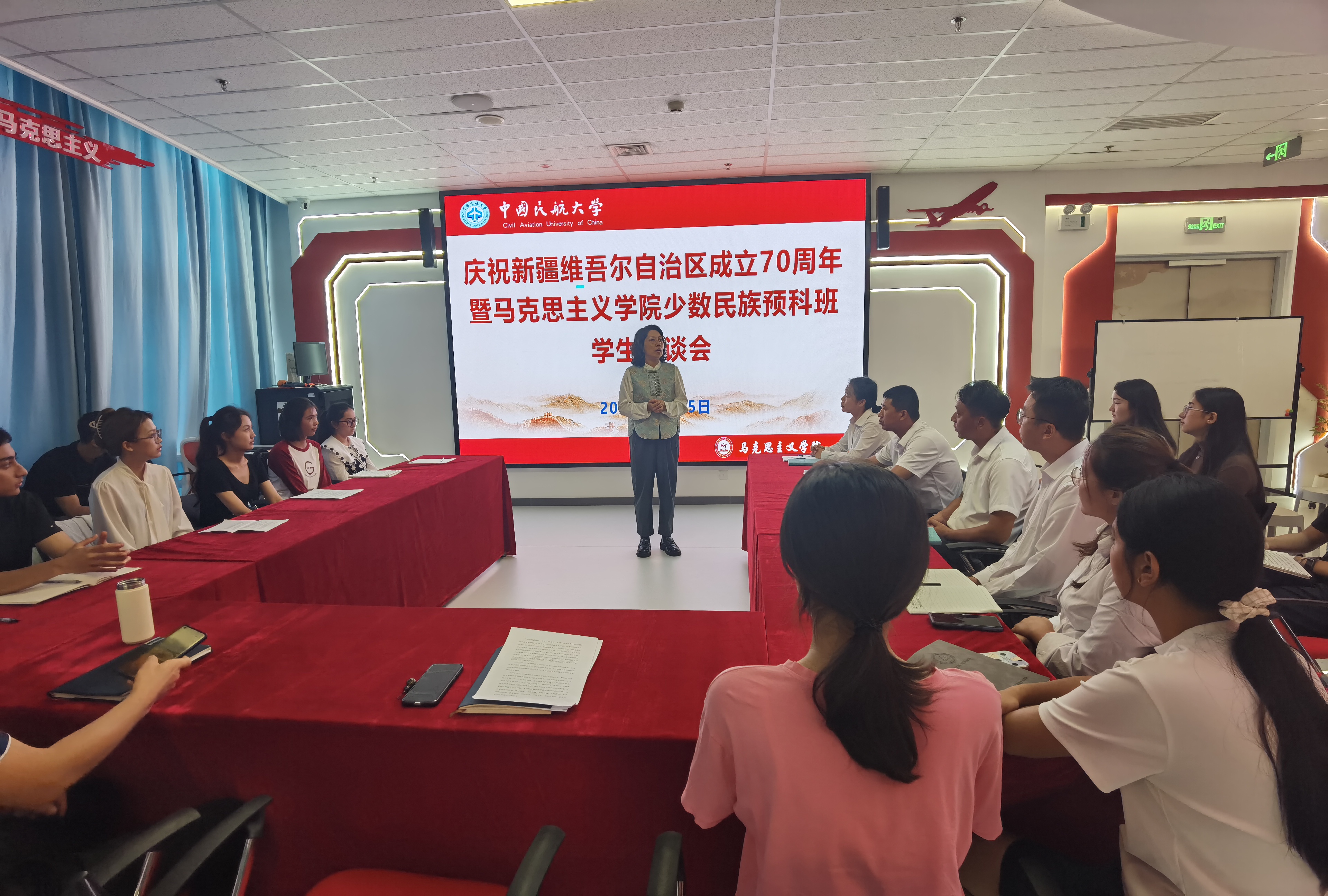 9月25日,中国民航大学马克思主义学院举行了庆祝新疆维吾尔自治区成立70周年暨少数民族预科班交流座谈会,集体观看新疆维吾尔自治区成立70周年庆祝大会实况。马克思主义学院领导、教师、新疆策勒县跟班教师及全体少数民族预科班同学参会。