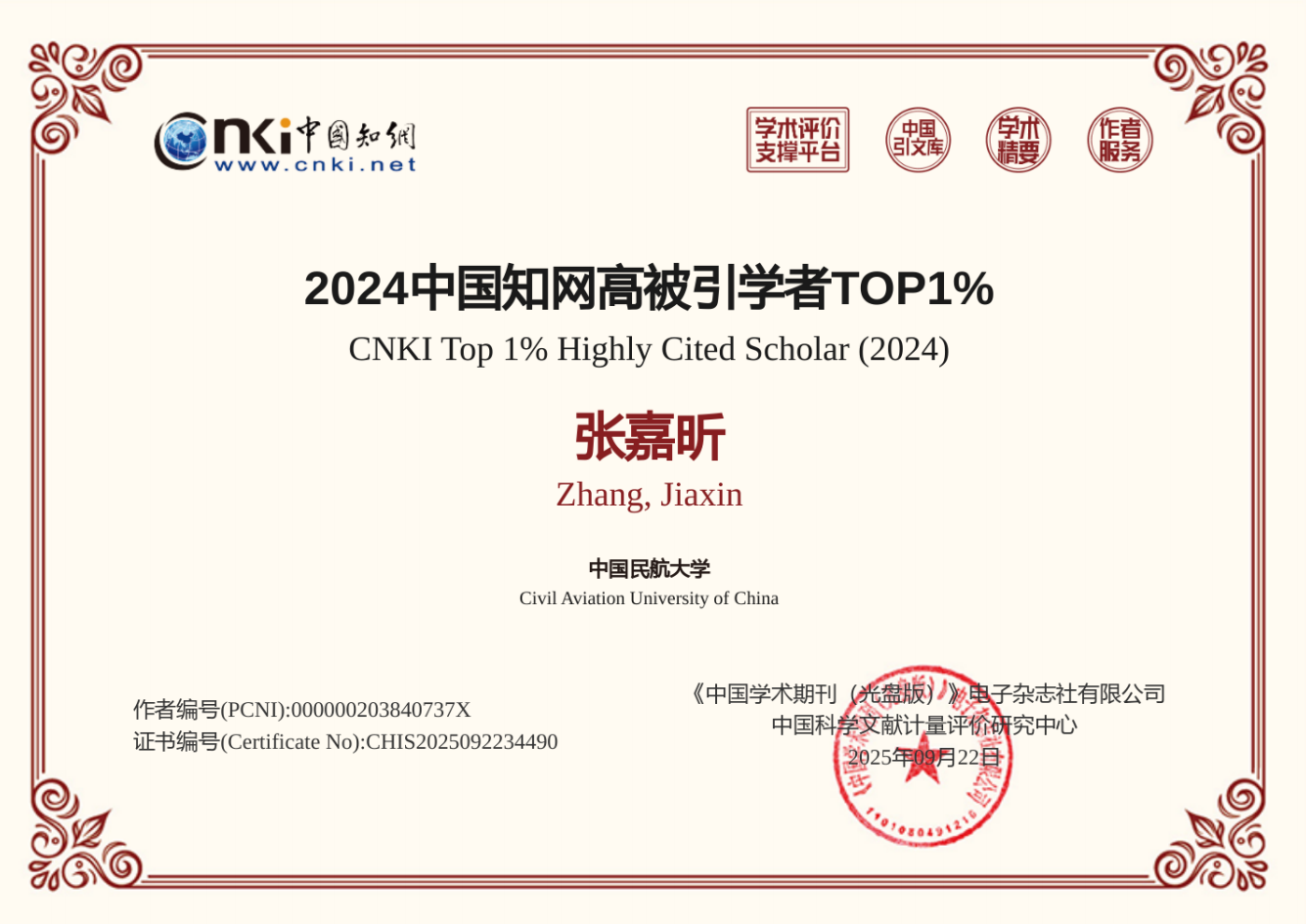 近日,中国知网中国科学文献计量评价研究中心公布了“2024中国知网高被引学者”预发布名单,中国民航大学马克思主义学院教授张嘉昕入选“2024中国知网高被引学者TOP1%”。