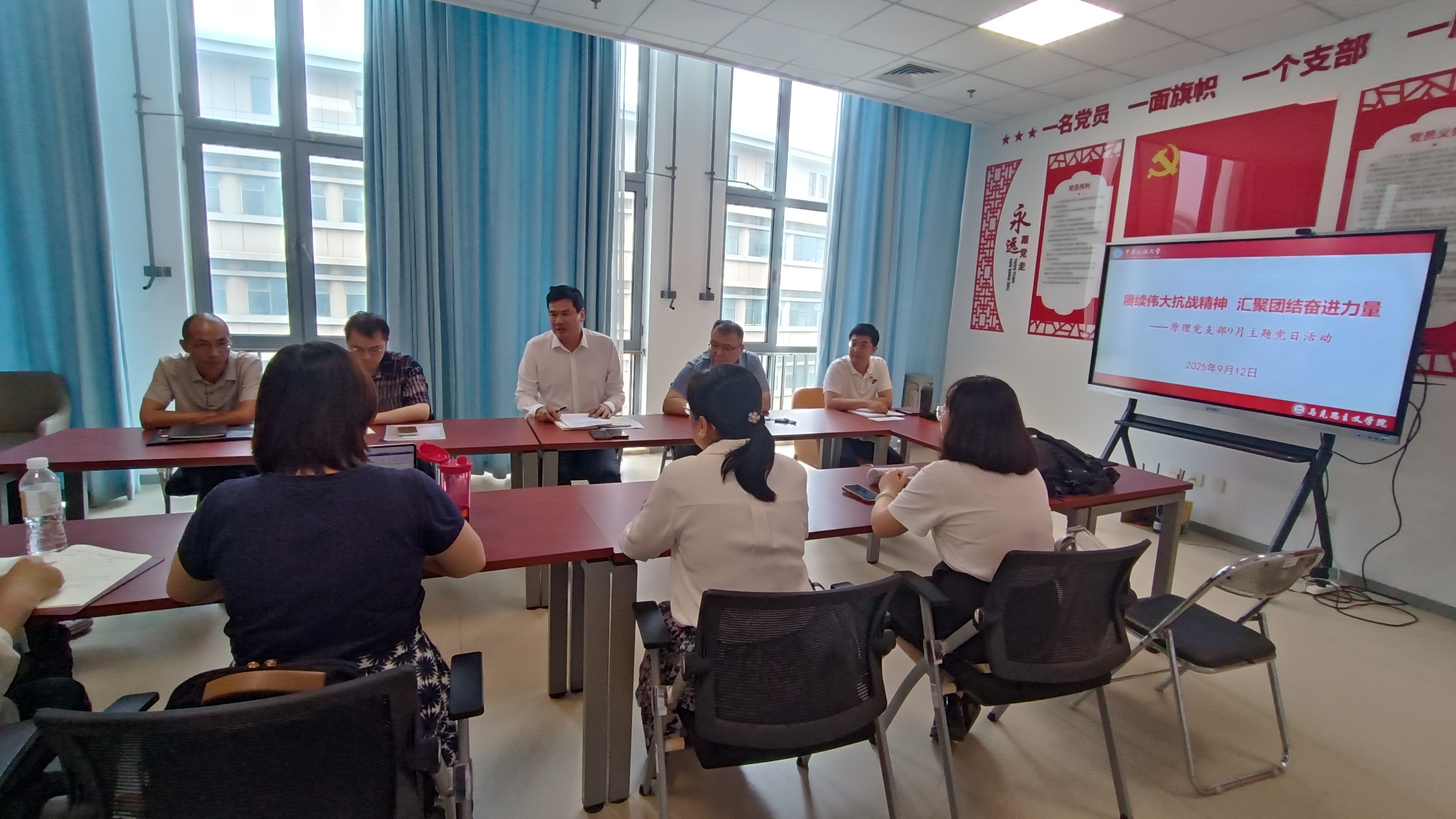 2025年9月12日下午,马克思主义学院原理教研室党支部在345党员活动室举行“赓续伟大抗战精神 汇聚团结奋进力量”主题党日活动。