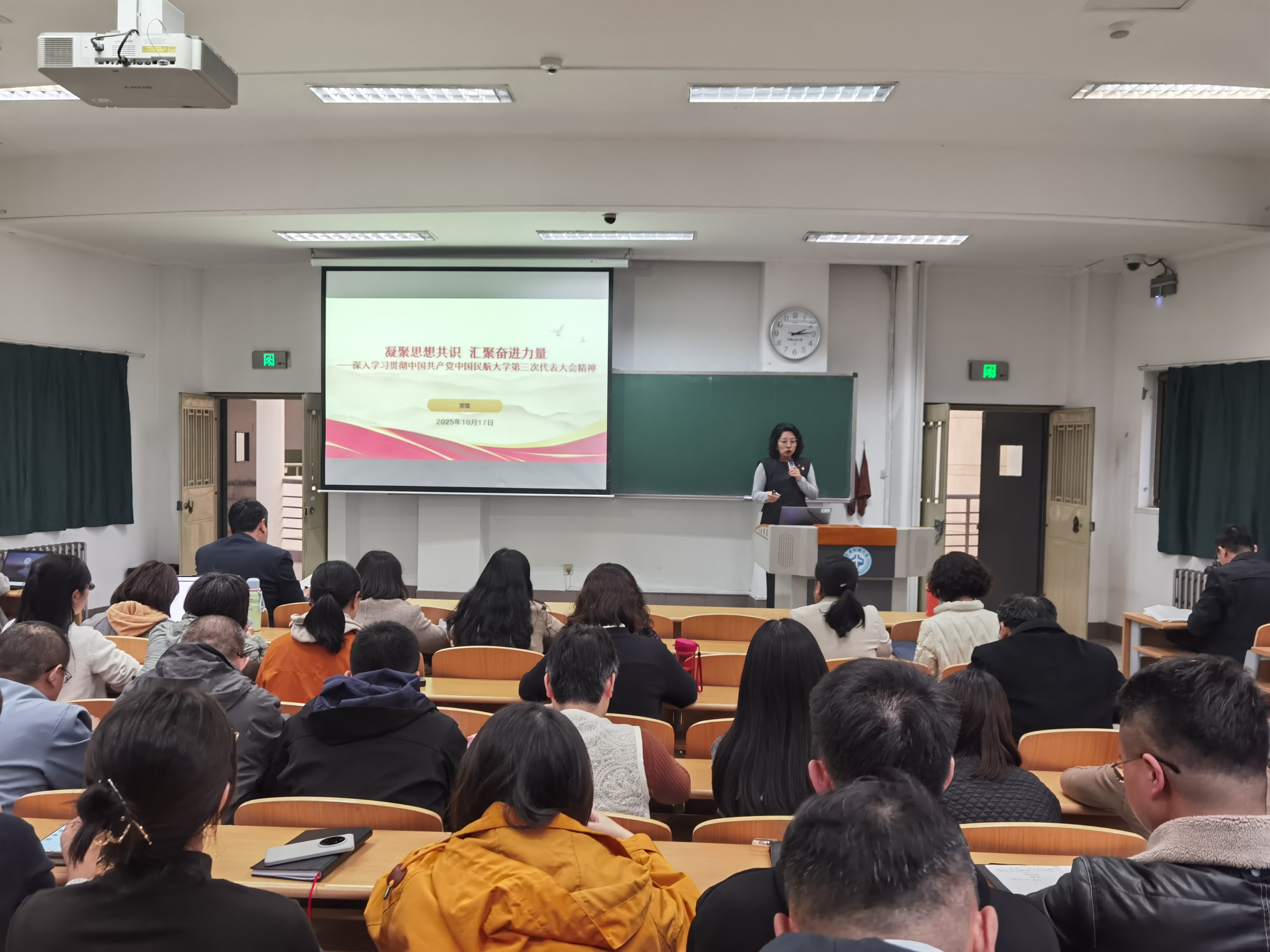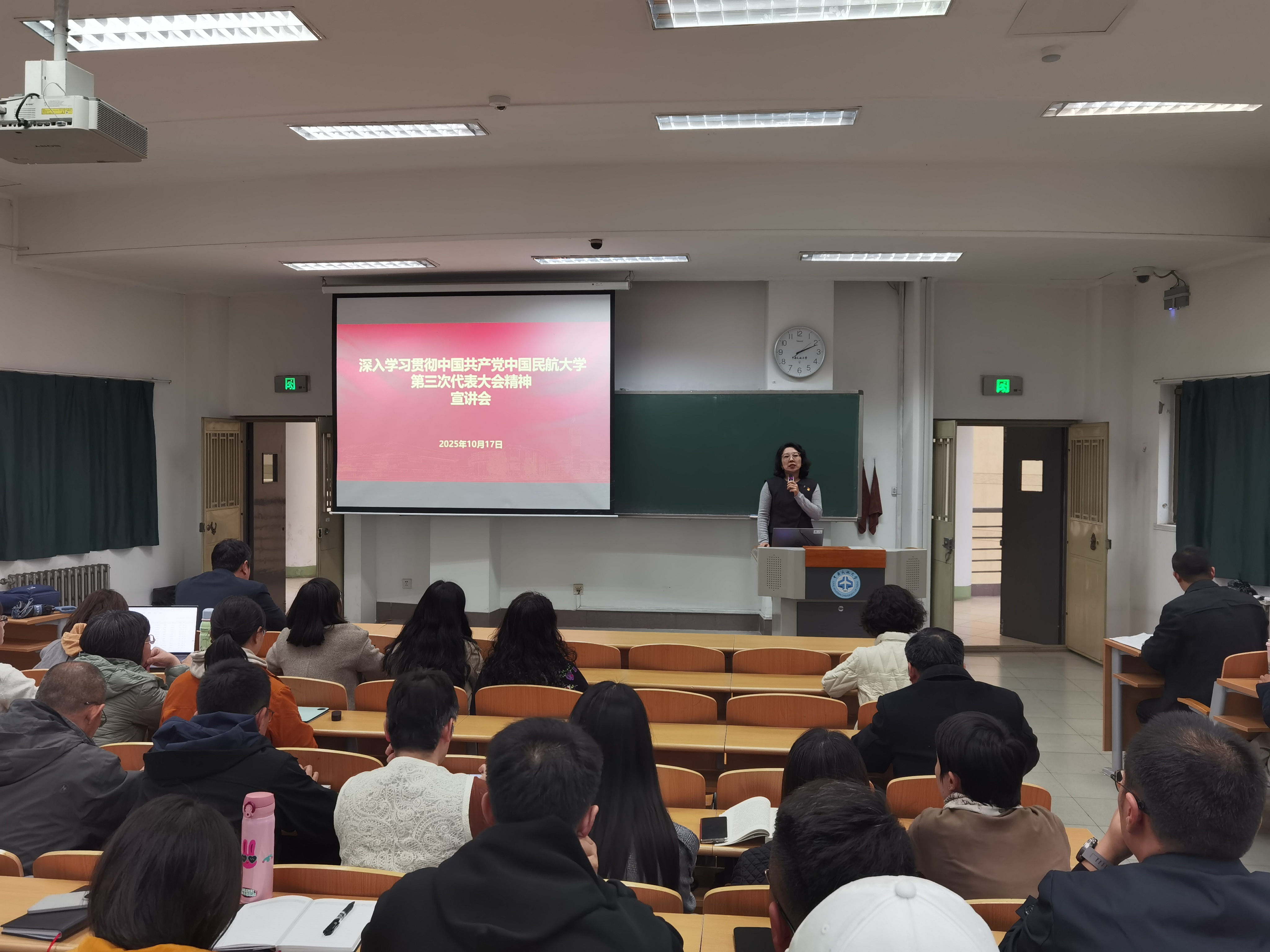 10月17日下午,马克思主义学院在南教1-303召开深入学习贯彻中国共产党中国民航大学第三次代表大会精神宣讲会暨党委理论学习中心组集体学习(扩大)会。会议由校党委宣传部副部长、马克思主义学院副院长主持,学校党委委员、马克思主义学院党委书记主讲,学院全体教职工参加。