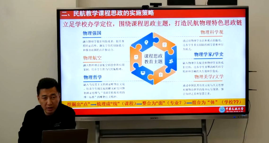 在经验分享环节,教育部课程思政教学名师、天津市一流本科建设课程负责人杨雄教授以“民航专业院校公共基础类课程思政建设的路径和方法”为题,深度拆解了其教学团队在课程思政建设中的探索历程与丰硕成果。杨雄教授结合生动教学案例,系统阐释了如何将思政元素有机融入专业教学,通过凝练物理学方法与观点、融入航空科技应用案例、挖掘物理学家成长故事等方式,打造独具民航特色的思政教育链条,实现价值塑造、知识传授与能力培养的同频共振,既提升课程前沿性与创新性,又培育学生求实创新的科学思维、勇攀高峰的科学精神与报效祖国的家国情怀。