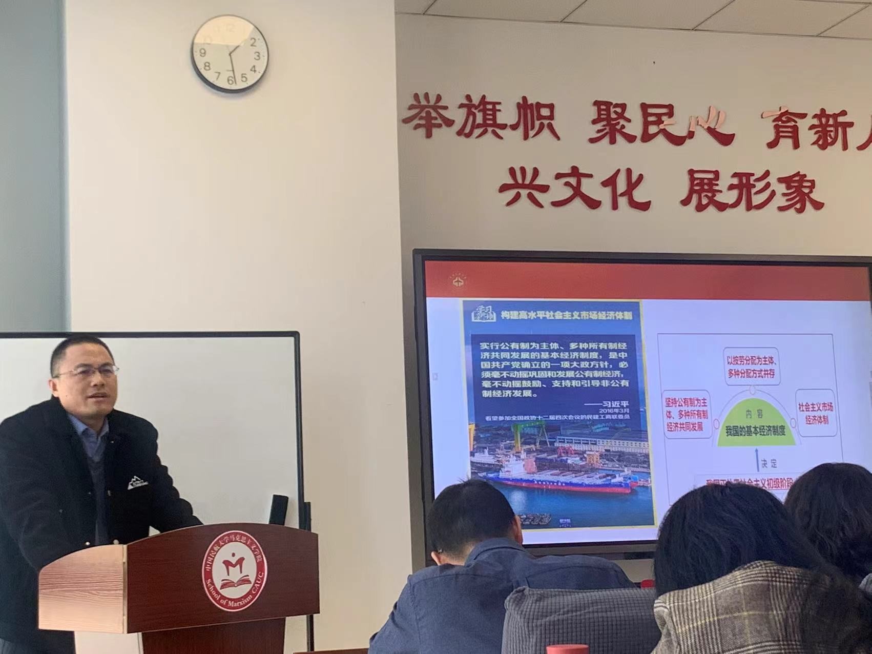 在专题领学环节,纲要教研室党支部王广峰老师和形势与政策教研室党支部何喜莲老师,对党的二十届四中全会精神进行了深度解读。王广峰老师主要从“经济”的视角,进行了题为“构建高水平社会主义市场经济”的专题解读。何喜莲老师主要从“文化”的视角,进行了题为“激发全民族文化创新创造活力”的专题解读。