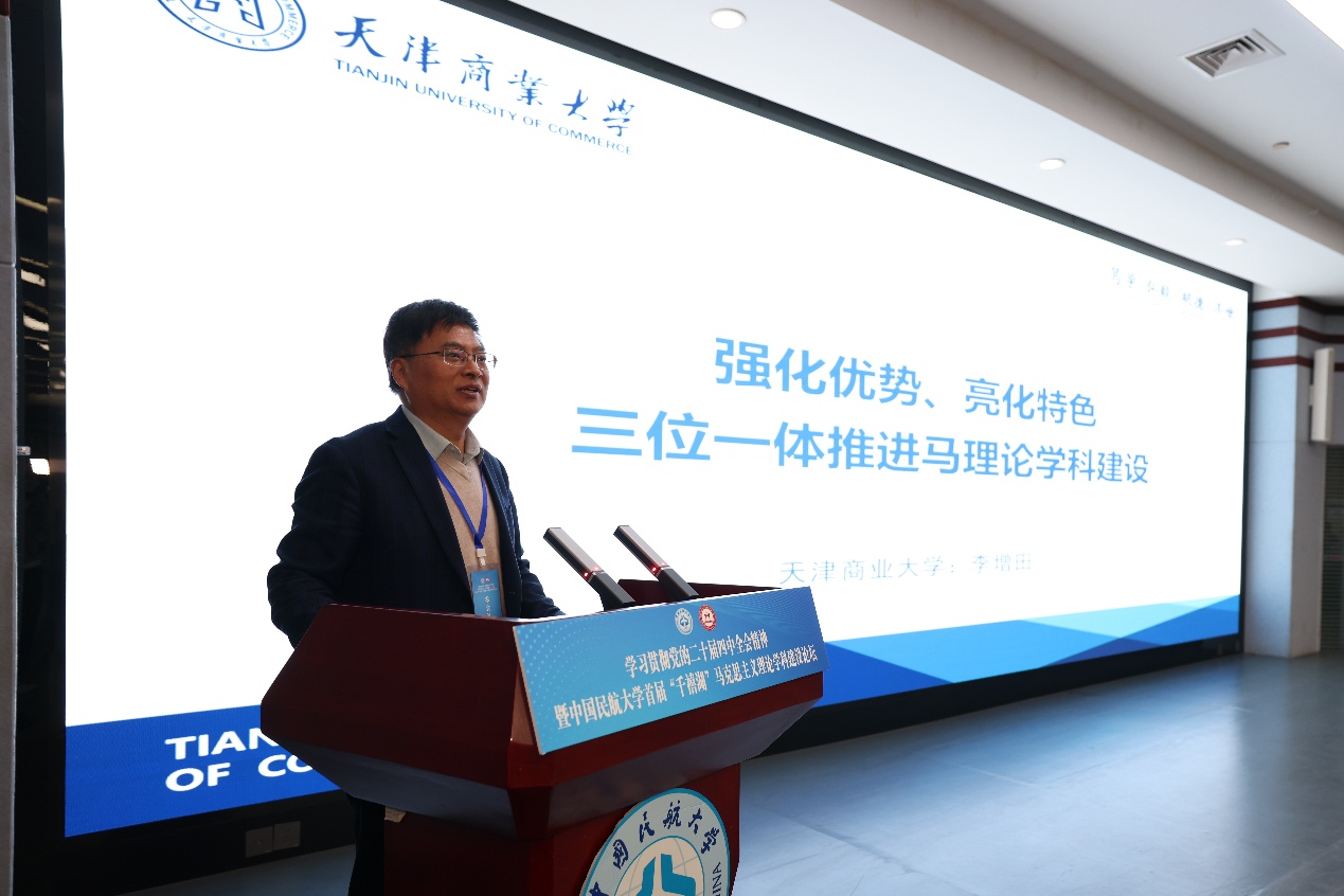 天津商业大学马克思主义学院院长李增田教授以“强化优势、亮化特色,三位一体推进马理论学科建设”为主题,从学术团队建设、科研平台建设、学术交流研讨等方面介绍了天津商业大学马克思主义理论学科建设的经验举措。