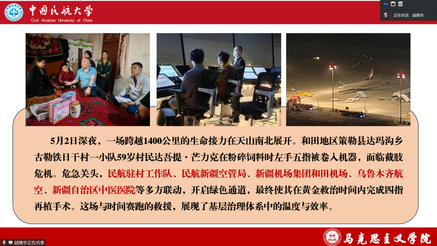 赵晓宇老师讲授专题党课。结合新疆策勒县一中的德育副校长挂职经历,以大中小学思政课建设一体化建设为主线,以地域特色和民航故事为补充,在深入分析了当前学校育人环境和学生特点的基础上,提出守正创新,推进新时代思政课建设的路径性反思。