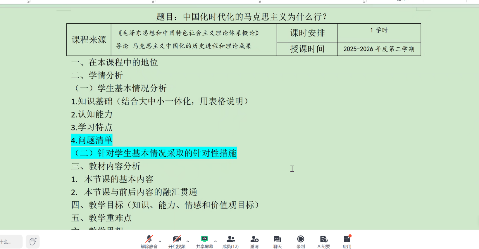 会议始终坚持推进党建与业务深度融合,赋能思政课高质量发展。王冬雪老师结合天津市青教赛备赛实践,就备赛中产生的关于AI融入课程教学及大中小学思政课一体化有机体现等问题与支部教师进行激烈有效的互动讨论。